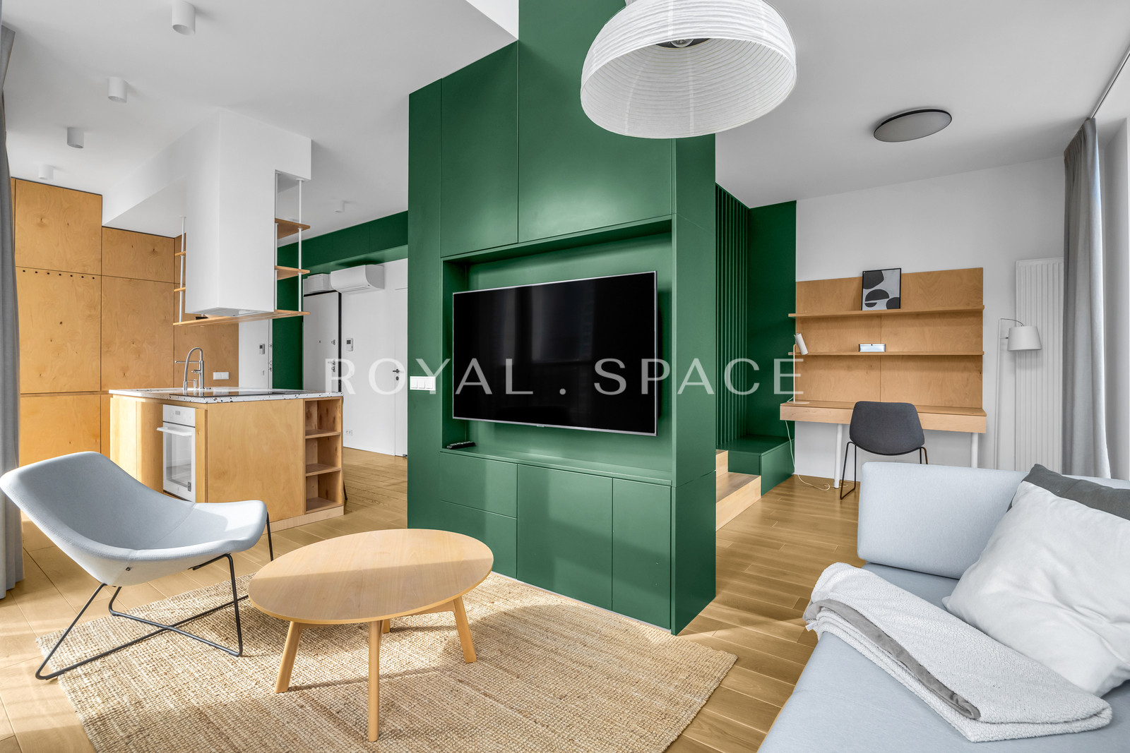 This exclusive, two-story penthouse, with an area of 61 sq m, is located on the 17th floor and offers stunning panoramic views of Warsaw. Its unique layout ensures spaciousness and comfort. The apartment includes: