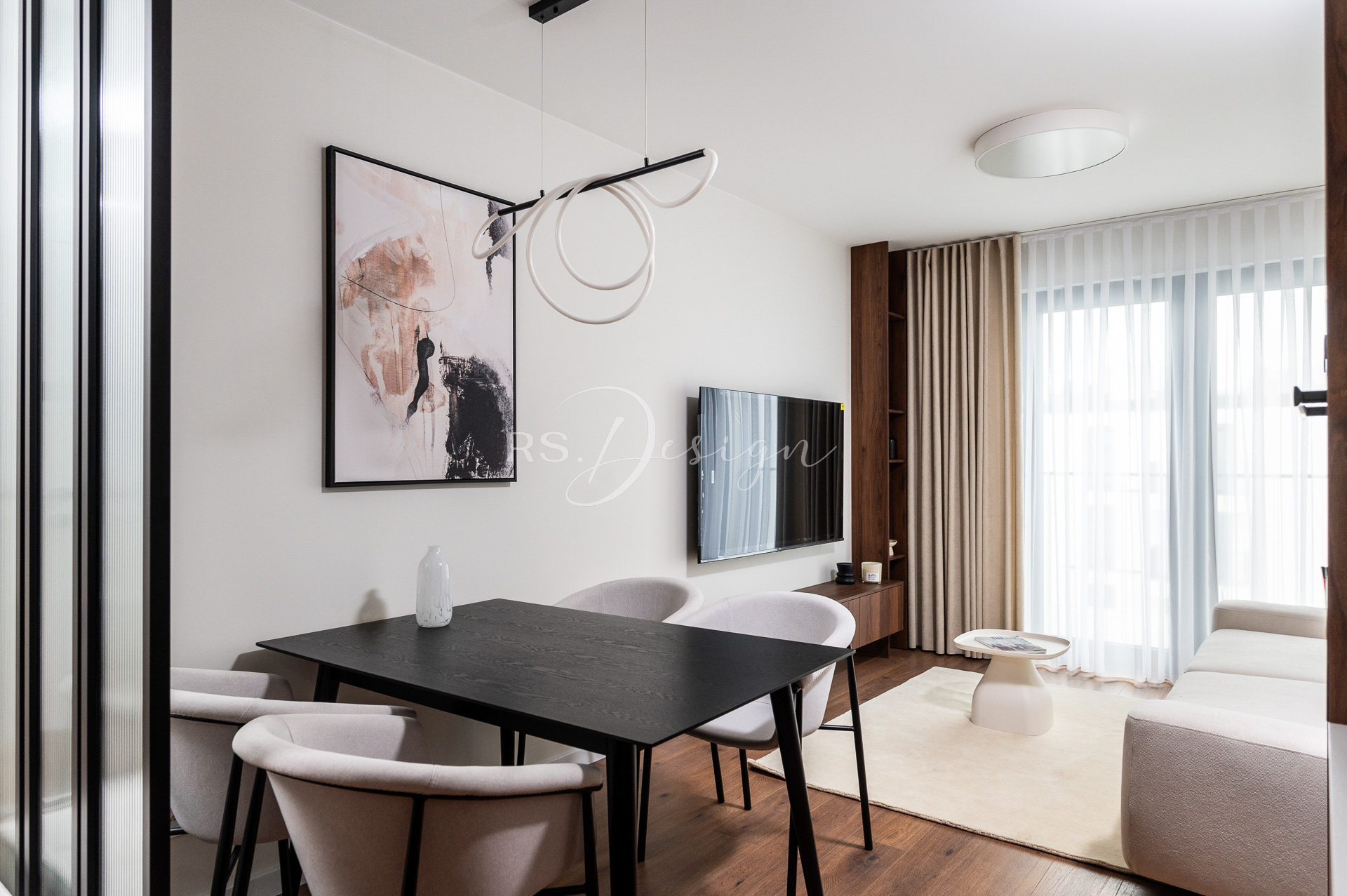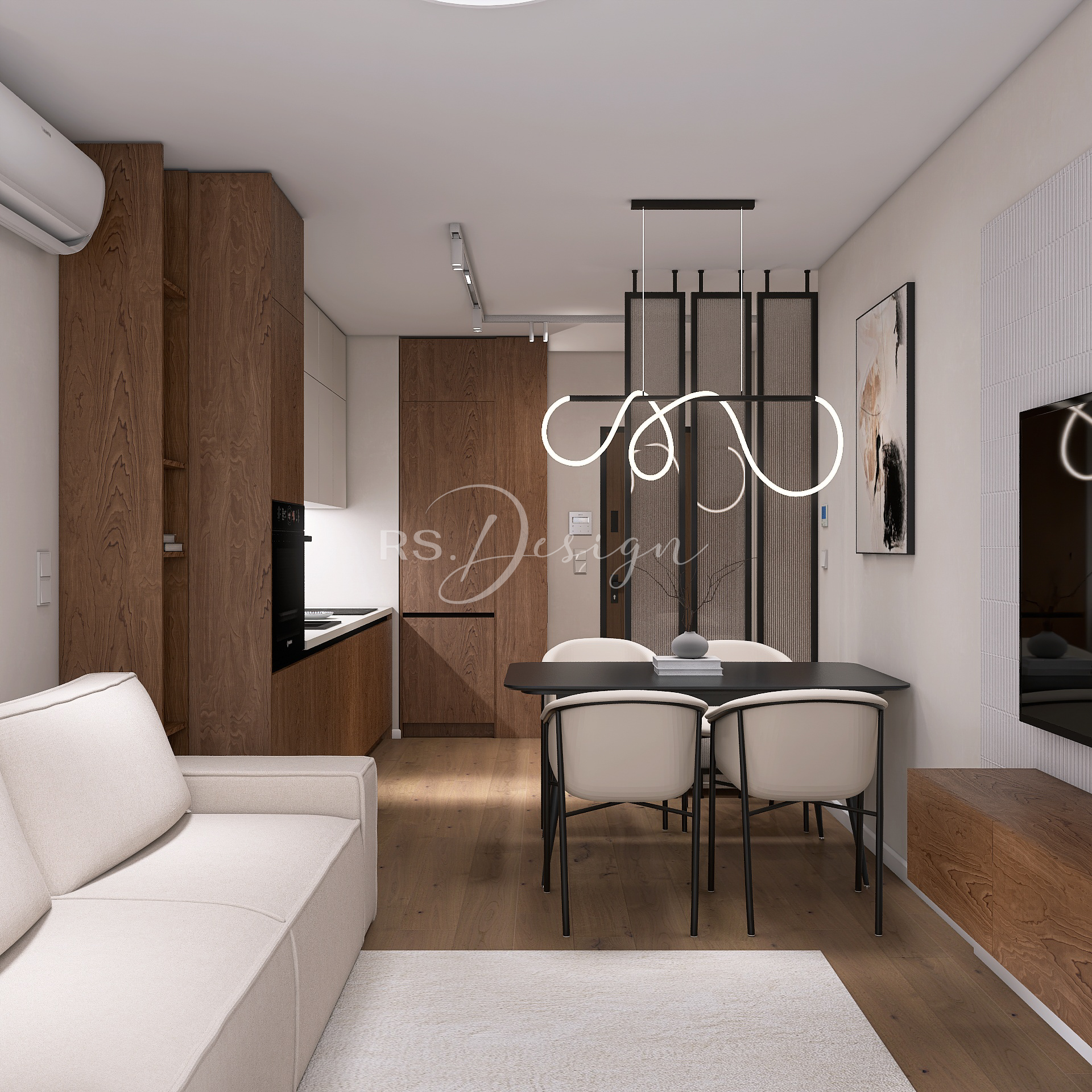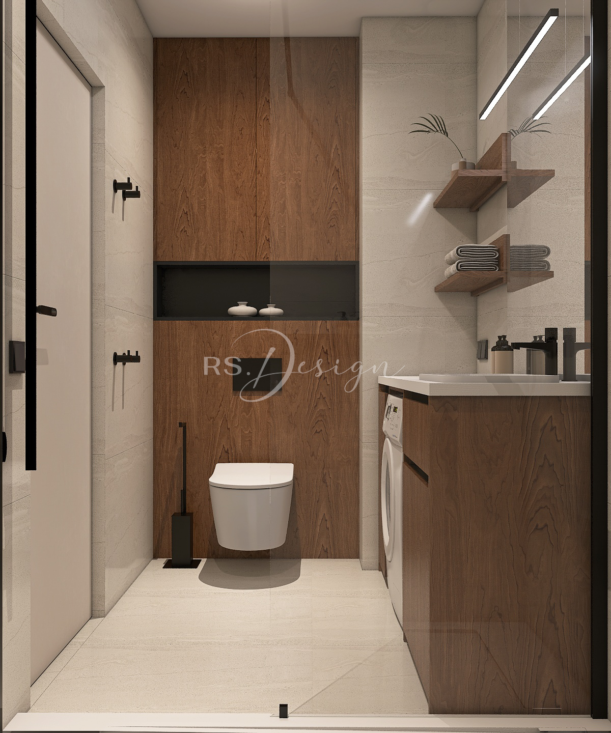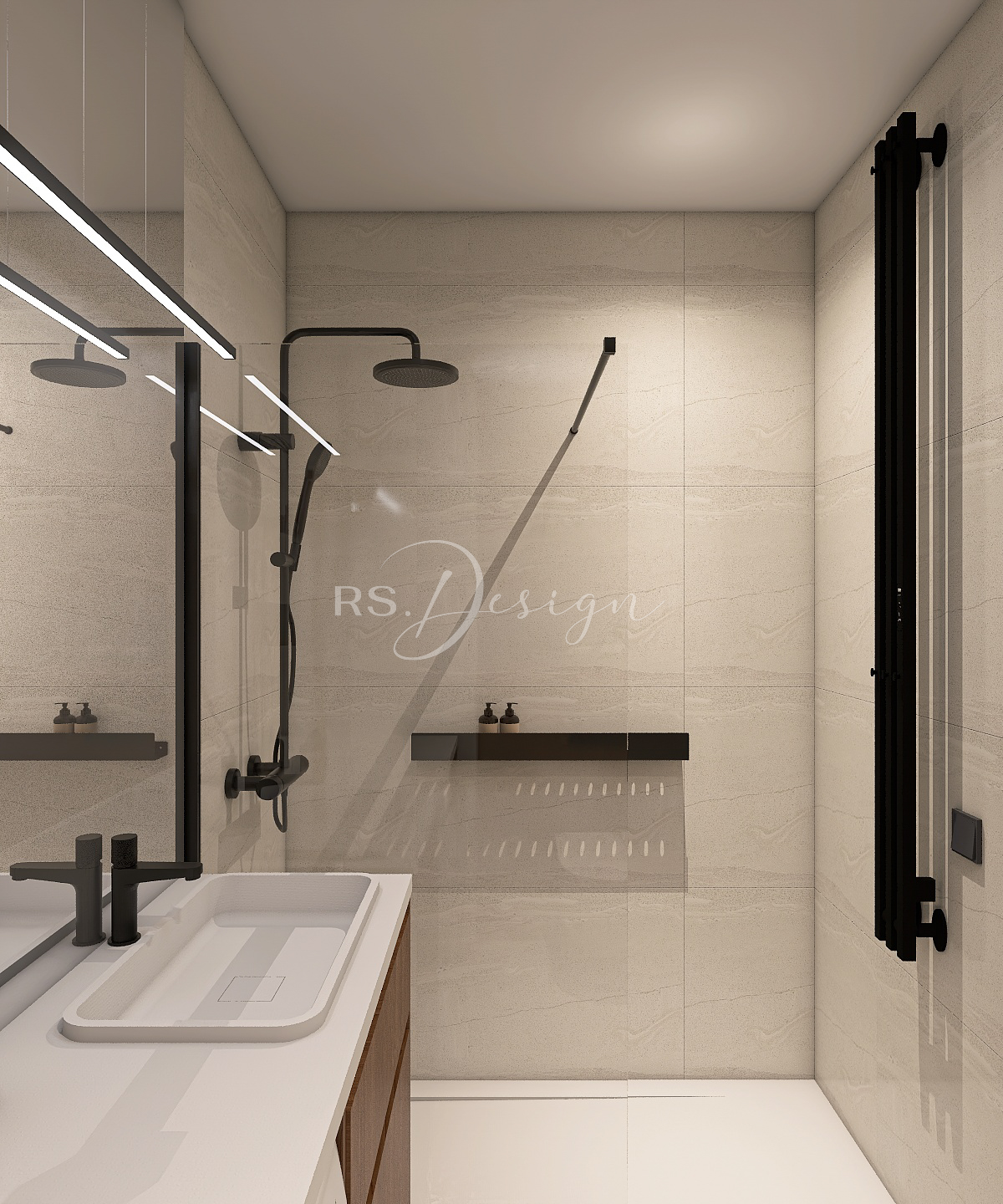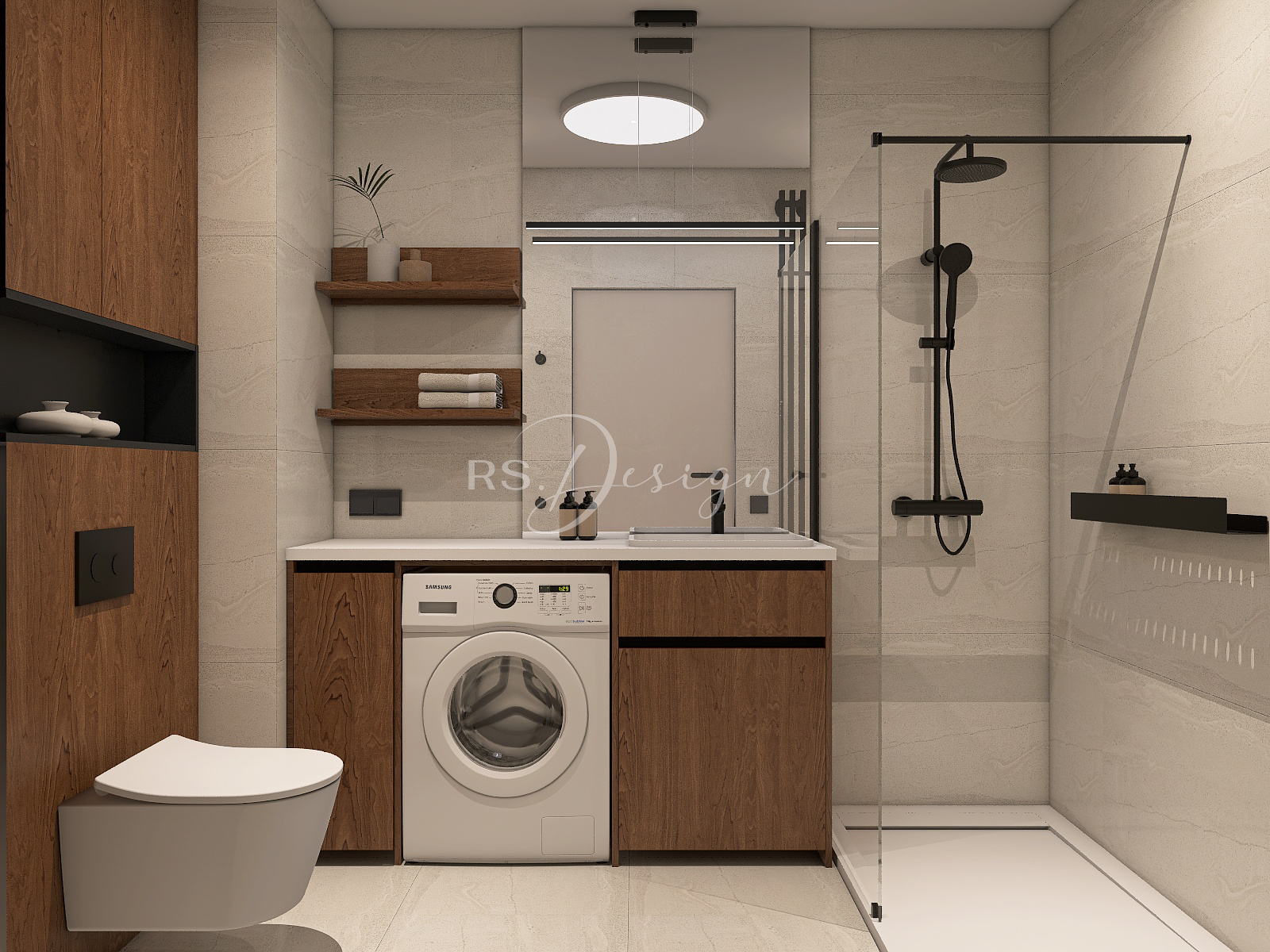 W tym projekcie skupiliśmy się na zaprojektowaniu parteru domu , dostosowując zakres prac do oczekiwań klienta. Wnętrza utrzymaliśmy w nowoczesnym, minimalistycznym stylu, łącząc naturalne materiały z eleganckimi akcentami. Całość opiera się na harmonijnym połączeniu ciepłych odcieni drewna, jasnych powierzchni i czarnych detali, które nadają przestrzeni elegancji i funkcjonalności. Kuchnia to zabudowa na pełną wysokość, z kamiennymi blatami i dyskretnym oświetleniem podkreślającym jej nowoczesny charakter. W salonie i jadalni postawiliśmy na duże przeszklenia, które wpuszczają mnóstwo naturalnego światła, oraz starannie dobrane meble – jasną podłogę w jodełkę, beżową sofę i drewniany stół z oliwkowymi krzesłami. Łazienki zaprojektowaliśmy w spójnej estetyce, zestawiając drewno z jasnym kamieniem, a podświetlane okrągłe lustra i ryflowane szkło w kabinach prysznicowych dodają im lekkości i nowoczesnego charakteru. Każdy projekt dostosowujemy indywidualnie – niezależnie od tego, czy tworzymy koncepcję całego domu, czy tylko wybranej części.