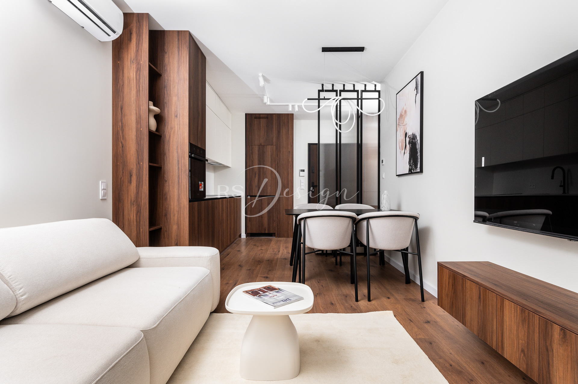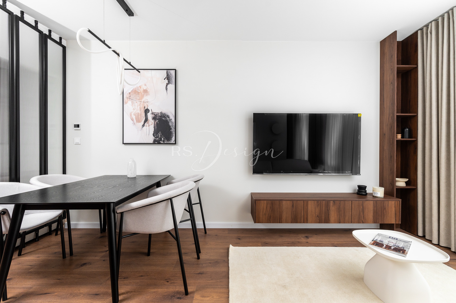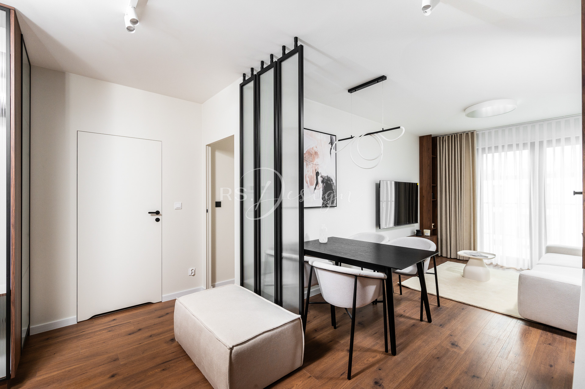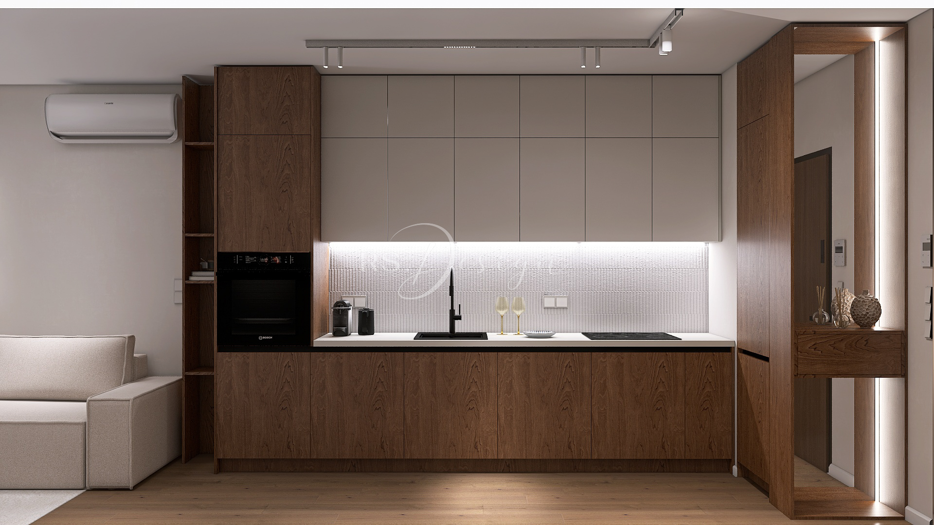W tym projekcie skupiliśmy się na zaprojektowaniu parteru domu , dostosowując zakres prac do oczekiwań klienta. Wnętrza utrzymaliśmy w nowoczesnym, minimalistycznym stylu, łącząc naturalne materiały z eleganckimi akcentami. Całość opiera się na harmonijnym połączeniu ciepłych odcieni drewna, jasnych powierzchni i czarnych detali, które nadają przestrzeni elegancji i funkcjonalności. Kuchnia to zabudowa na pełną wysokość, z kamiennymi blatami i dyskretnym oświetleniem podkreślającym jej nowoczesny charakter. W salonie i jadalni postawiliśmy na duże przeszklenia, które wpuszczają mnóstwo naturalnego światła, oraz starannie dobrane meble – jasną podłogę w jodełkę, beżową sofę i drewniany stół z oliwkowymi krzesłami. Łazienki zaprojektowaliśmy w spójnej estetyce, zestawiając drewno z jasnym kamieniem, a podświetlane okrągłe lustra i ryflowane szkło w kabinach prysznicowych dodają im lekkości i nowoczesnego charakteru. Każdy projekt dostosowujemy indywidualnie – niezależnie od tego, czy tworzymy koncepcję całego domu, czy tylko wybranej części.