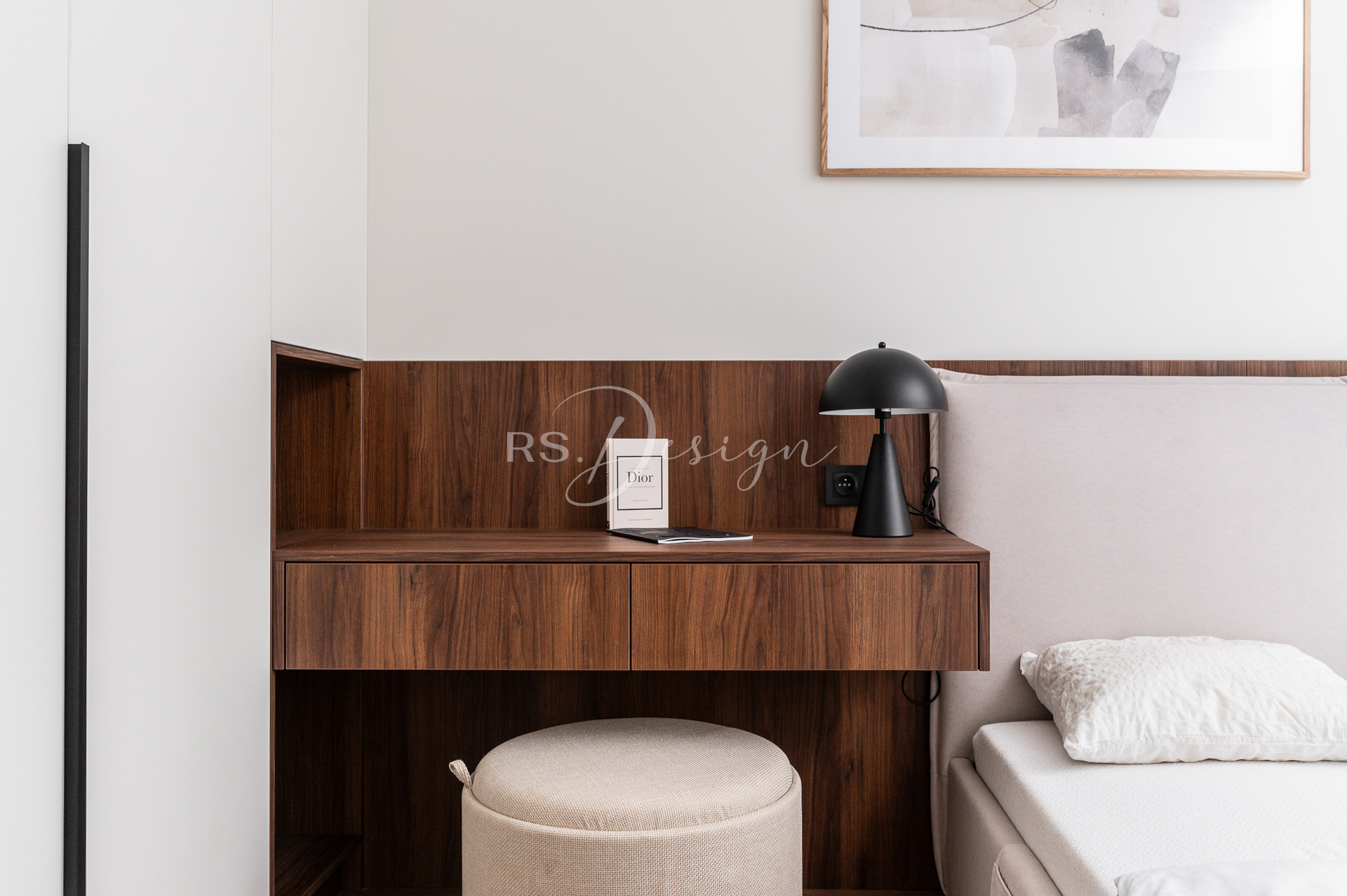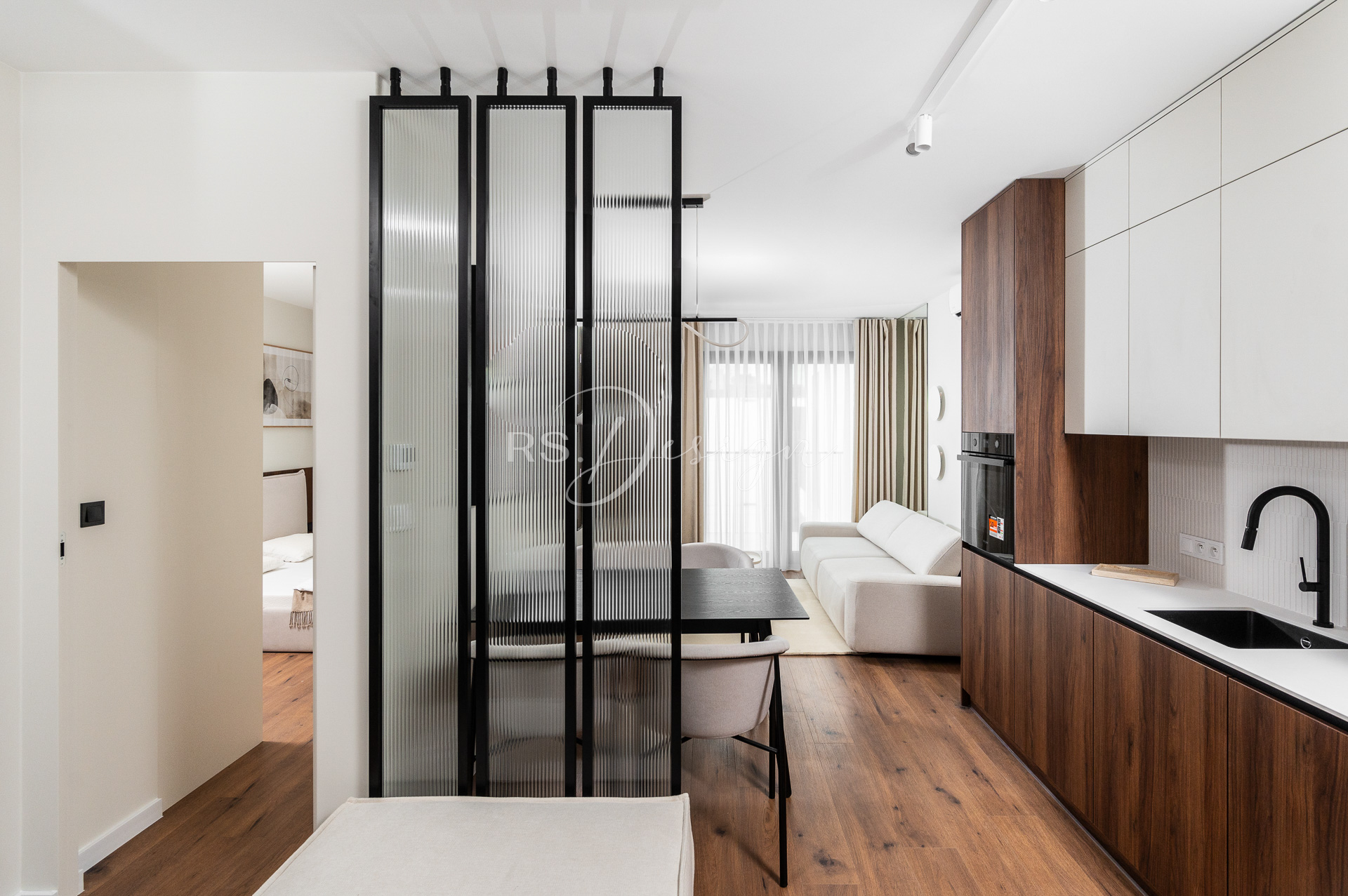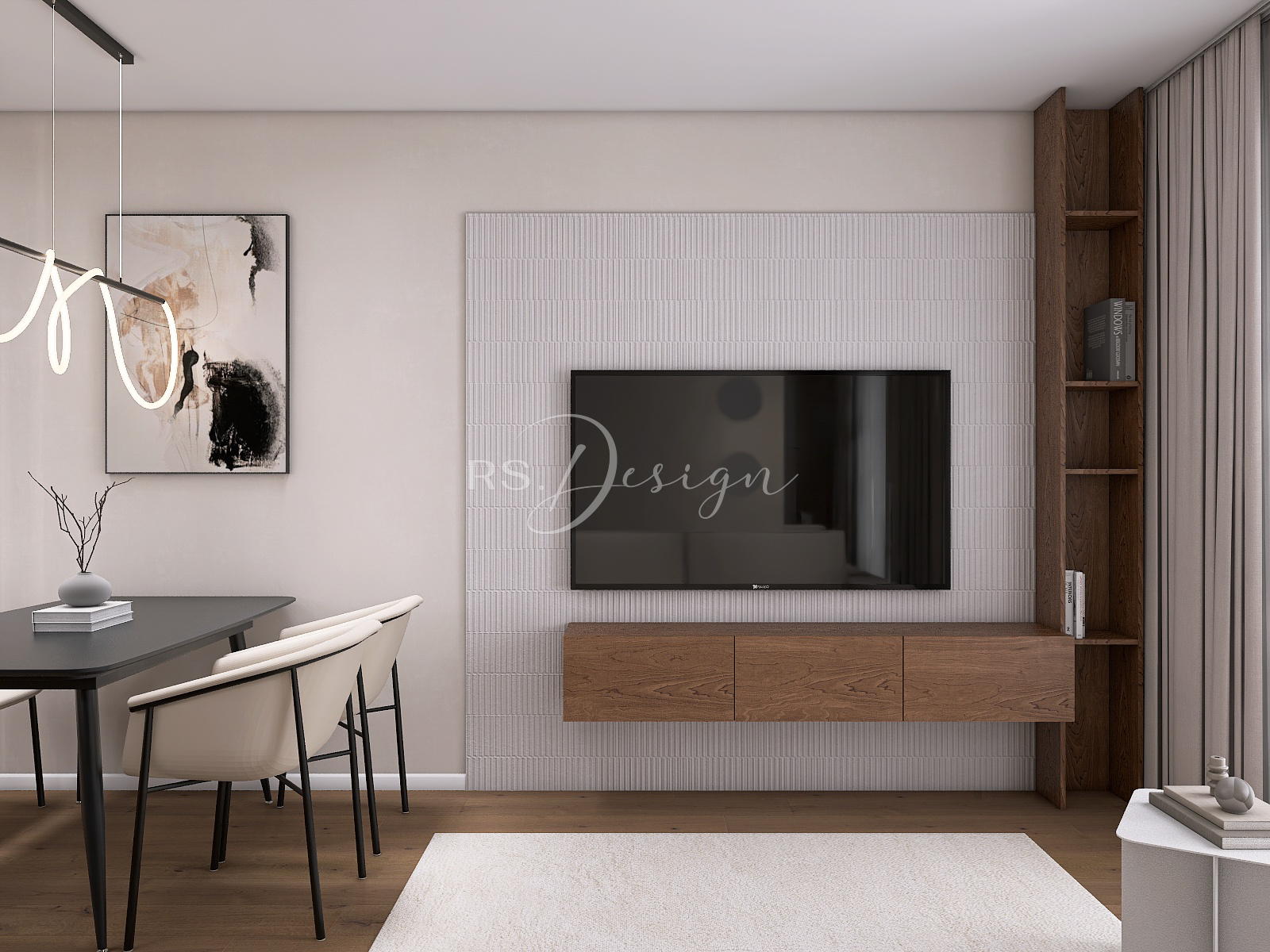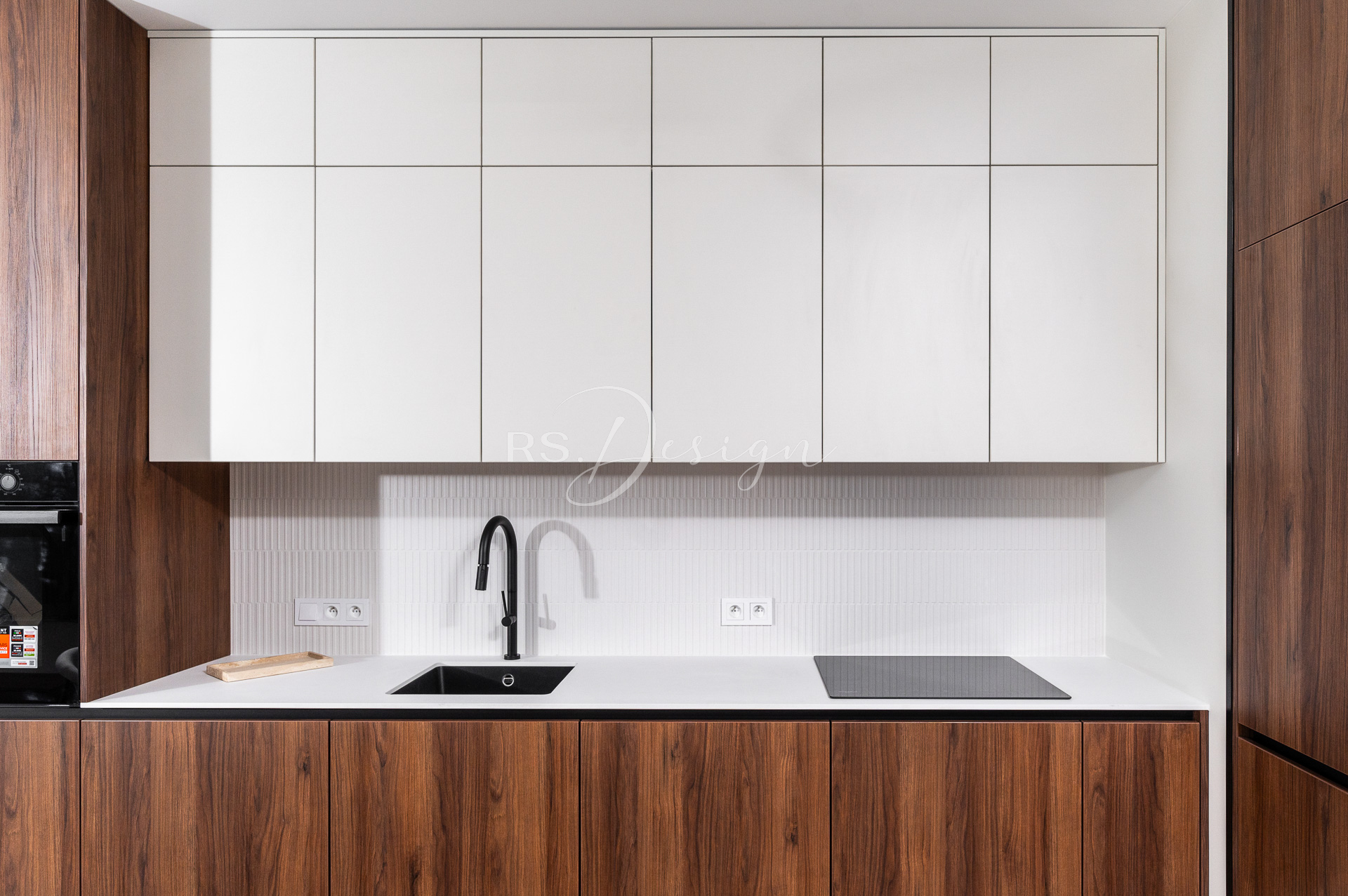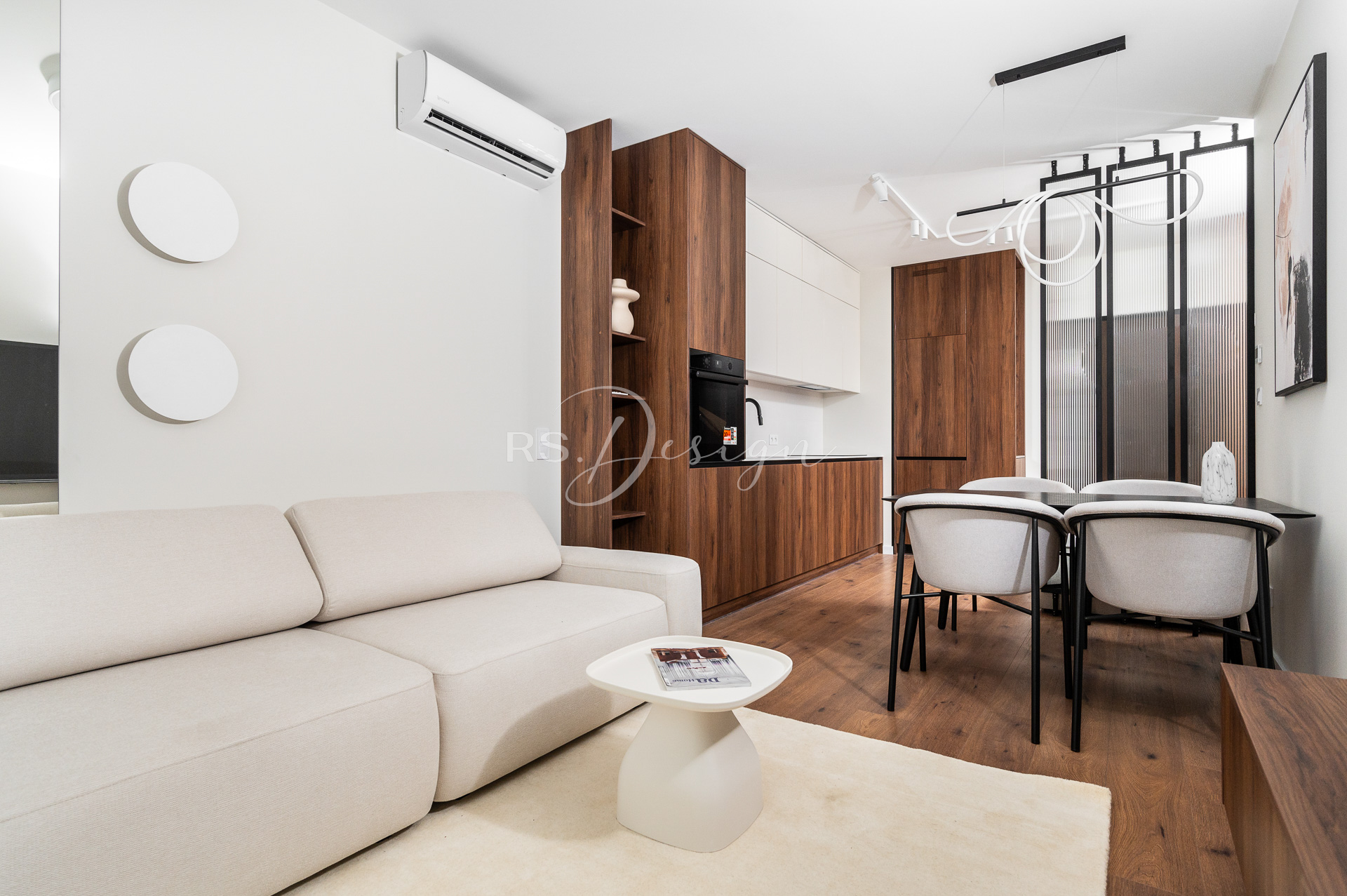 W tym projekcie skupiliśmy się na zaprojektowaniu parteru domu , dostosowując zakres prac do oczekiwań klienta. Wnętrza utrzymaliśmy w nowoczesnym, minimalistycznym stylu, łącząc naturalne materiały z eleganckimi akcentami. Całość opiera się na harmonijnym połączeniu ciepłych odcieni drewna, jasnych powierzchni i czarnych detali, które nadają przestrzeni elegancji i funkcjonalności. Kuchnia to zabudowa na pełną wysokość, z kamiennymi blatami i dyskretnym oświetleniem podkreślającym jej nowoczesny charakter. W salonie i jadalni postawiliśmy na duże przeszklenia, które wpuszczają mnóstwo naturalnego światła, oraz starannie dobrane meble – jasną podłogę w jodełkę, beżową sofę i drewniany stół z oliwkowymi krzesłami. Łazienki zaprojektowaliśmy w spójnej estetyce, zestawiając drewno z jasnym kamieniem, a podświetlane okrągłe lustra i ryflowane szkło w kabinach prysznicowych dodają im lekkości i nowoczesnego charakteru. Każdy projekt dostosowujemy indywidualnie – niezależnie od tego, czy tworzymy koncepcję całego domu, czy tylko wybranej części.