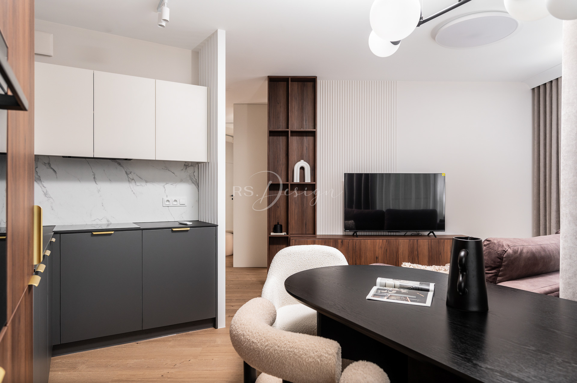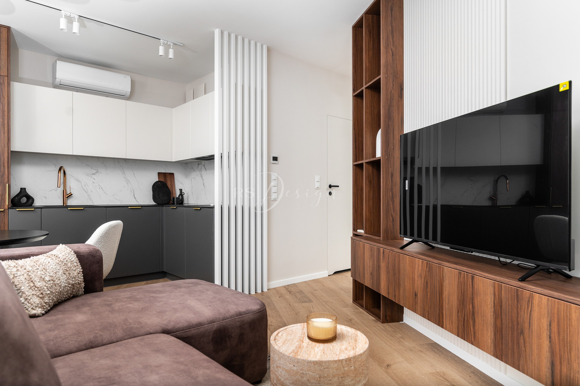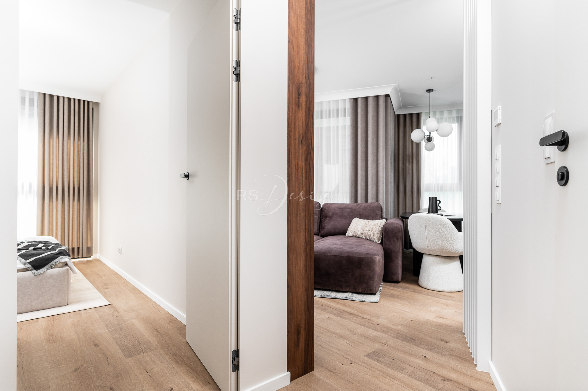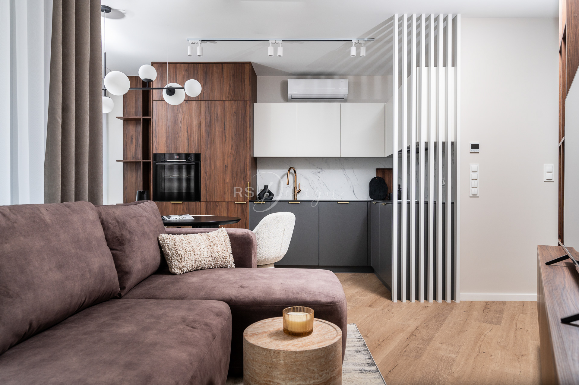 Realizacja apartamentu zaprojektowanego z myślą o najmie długoterminowym, który został wynajęty od razu po zakończeniu realizacji. Pomimo nierównoległych ścian udało się stworzyć ergonomiczny układ zapewniający wygodę przyszłym mieszkańcom. Strefa dzienna z aneksem kuchennym została urządzona w stonowanej palecie barw, gdzie ciepłe drewno i naturalne materiały współgrają z minimalistycznymi formami mebli. Wnętrze uzupełniają designerskie detale, takie jak miękka sofa w ciemnym odcieniu, elegancki stół z wygodnymi krzesłami oraz nastrojowe oświetlenie. Royal Space Design wspiera inwestorów i deweloperów w tworzeniu wnętrz, które nie tylko podnoszą komfort życia, ale także zwiększają wartość nieruchomości i wyróżniają ofertę na rynku – co potwierdza szybki sukces tej realizacji.