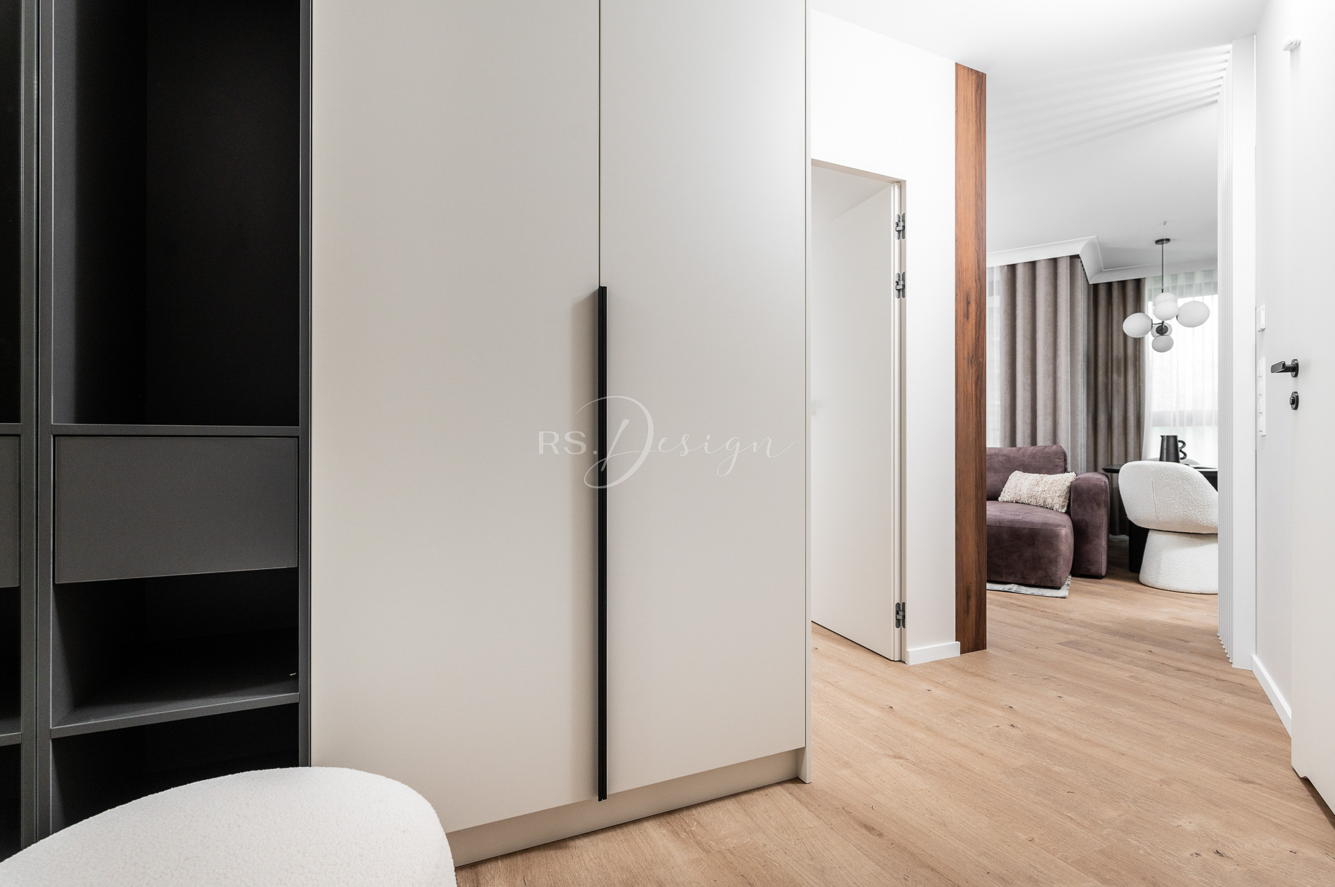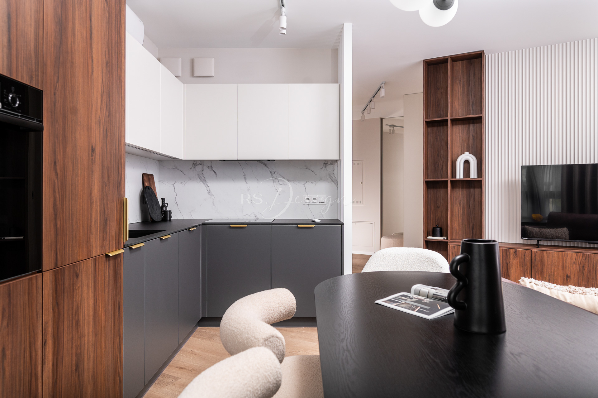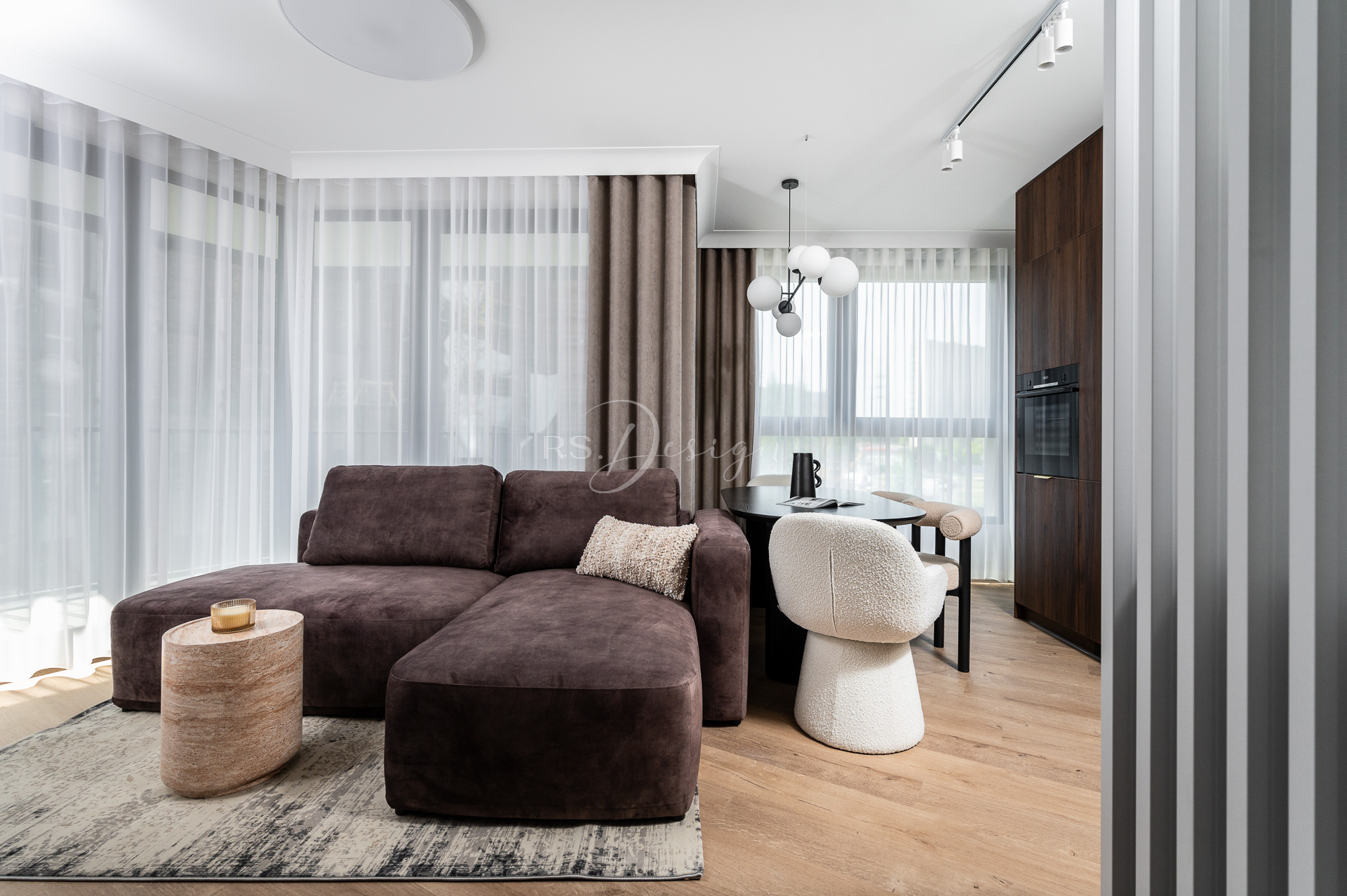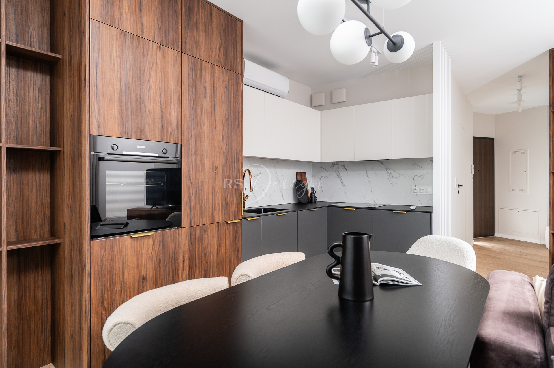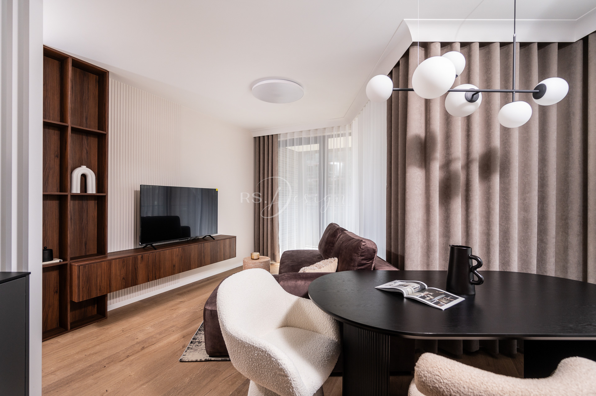 Realizacja apartamentu zaprojektowanego z myślą o najmie długoterminowym, który został wynajęty od razu po zakończeniu realizacji. Pomimo nierównoległych ścian udało się stworzyć ergonomiczny układ zapewniający wygodę przyszłym mieszkańcom. Strefa dzienna z aneksem kuchennym została urządzona w stonowanej palecie barw, gdzie ciepłe drewno i naturalne materiały współgrają z minimalistycznymi formami mebli. Wnętrze uzupełniają designerskie detale, takie jak miękka sofa w ciemnym odcieniu, elegancki stół z wygodnymi krzesłami oraz nastrojowe oświetlenie. Royal Space Design wspiera inwestorów i deweloperów w tworzeniu wnętrz, które nie tylko podnoszą komfort życia, ale także zwiększają wartość nieruchomości i wyróżniają ofertę na rynku – co potwierdza szybki sukces tej realizacji.