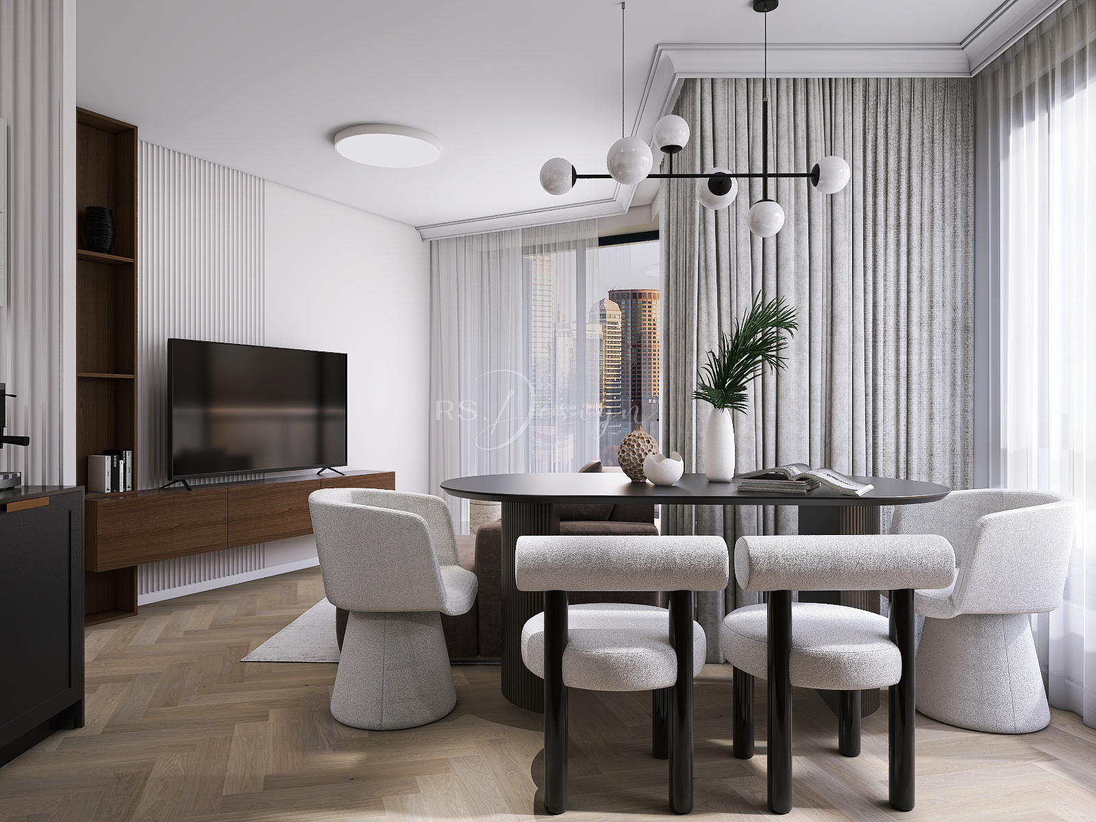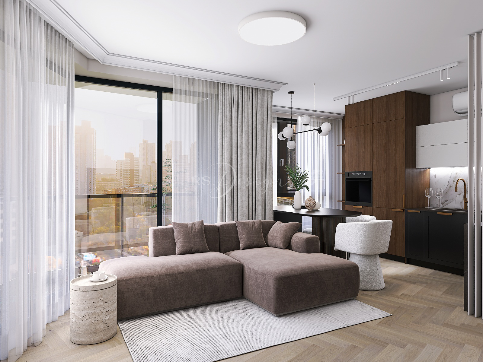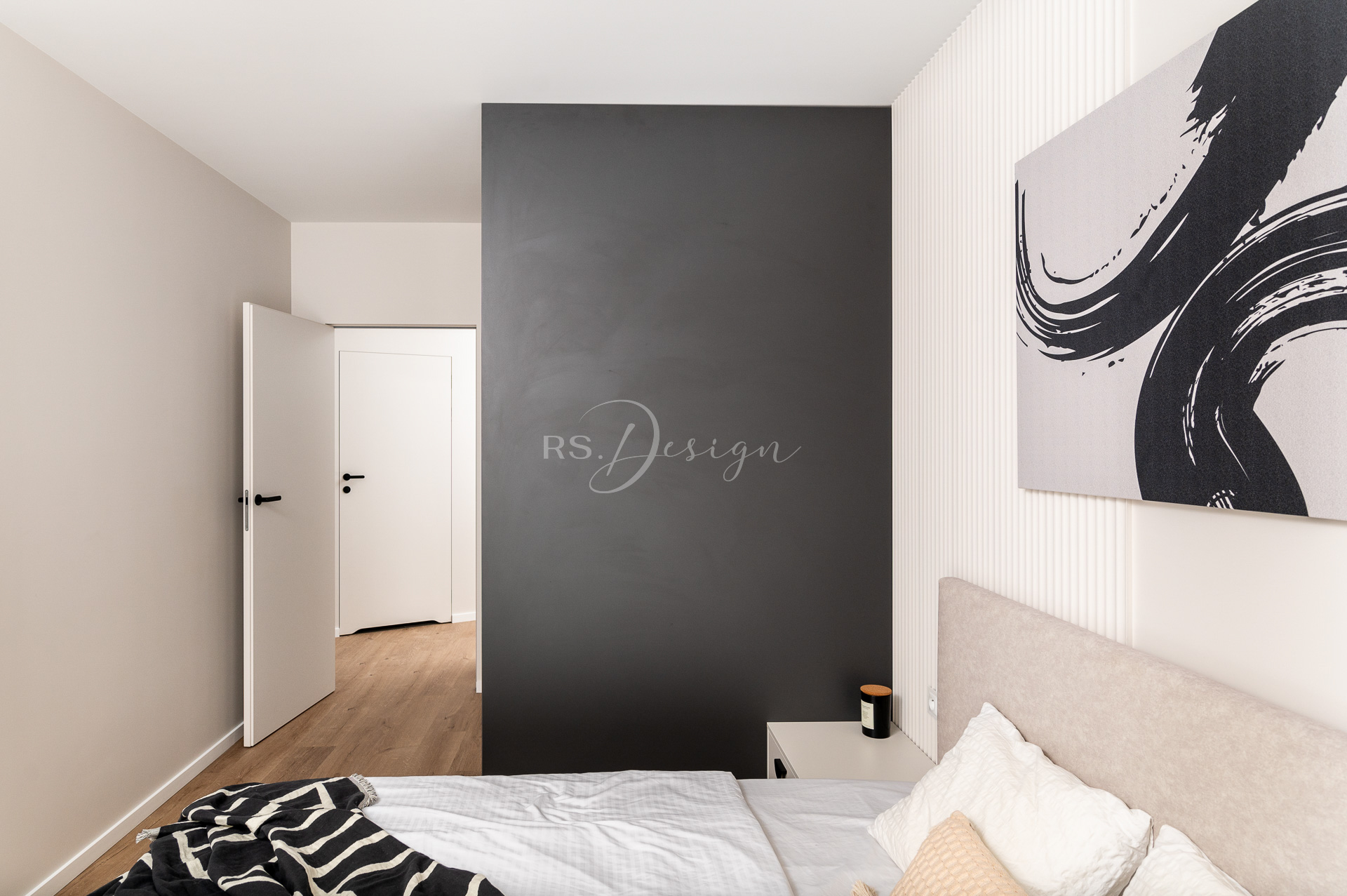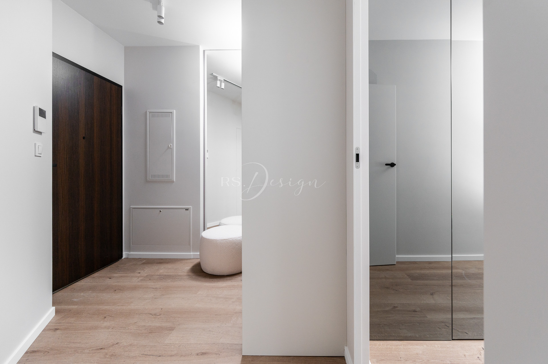 Realizacja apartamentu zaprojektowanego z myślą o najmie długoterminowym, który został wynajęty od razu po zakończeniu realizacji. Pomimo nierównoległych ścian udało się stworzyć ergonomiczny układ zapewniający wygodę przyszłym mieszkańcom. Strefa dzienna z aneksem kuchennym została urządzona w stonowanej palecie barw, gdzie ciepłe drewno i naturalne materiały współgrają z minimalistycznymi formami mebli. Wnętrze uzupełniają designerskie detale, takie jak miękka sofa w ciemnym odcieniu, elegancki stół z wygodnymi krzesłami oraz nastrojowe oświetlenie. Royal Space Design wspiera inwestorów i deweloperów w tworzeniu wnętrz, które nie tylko podnoszą komfort życia, ale także zwiększają wartość nieruchomości i wyróżniają ofertę na rynku – co potwierdza szybki sukces tej realizacji.