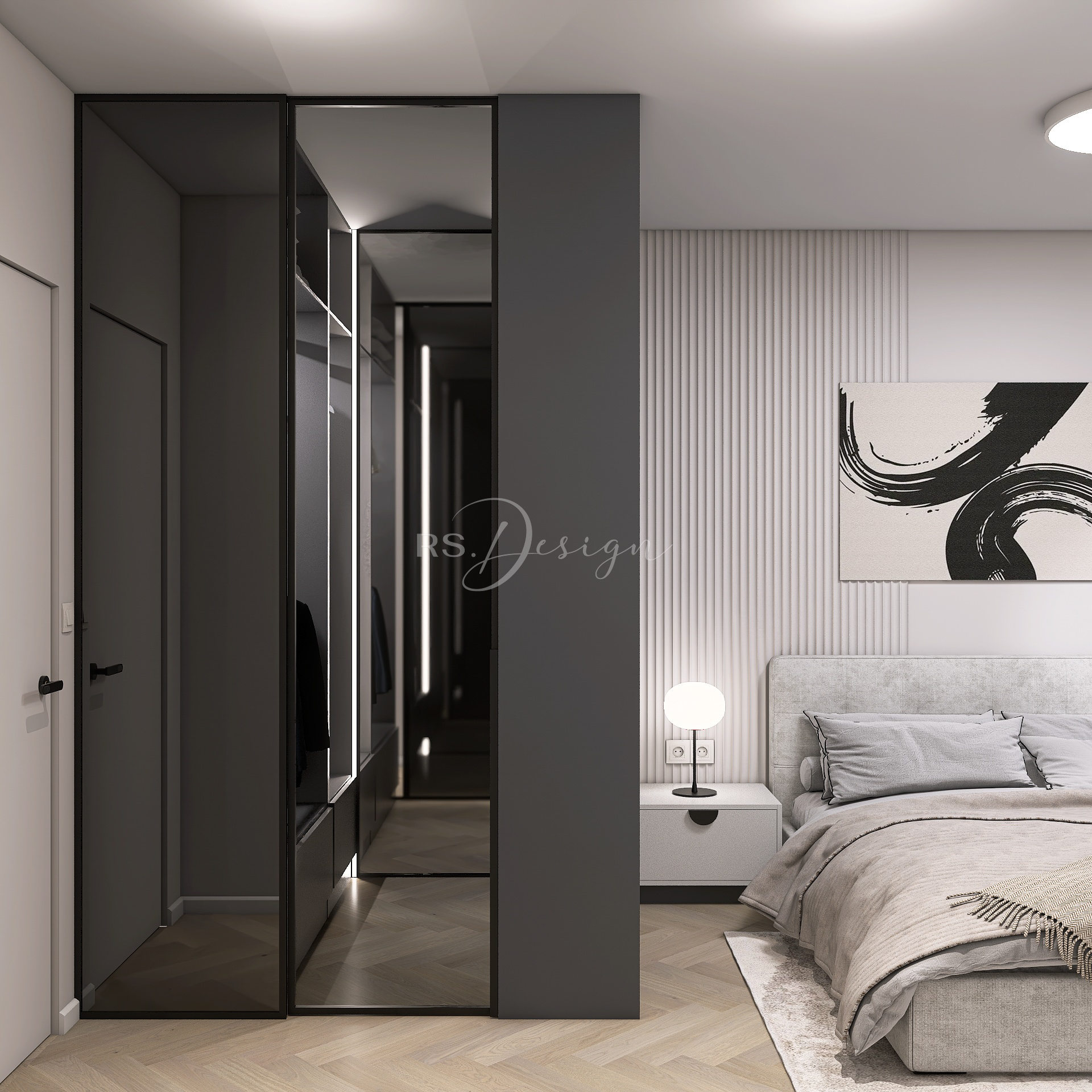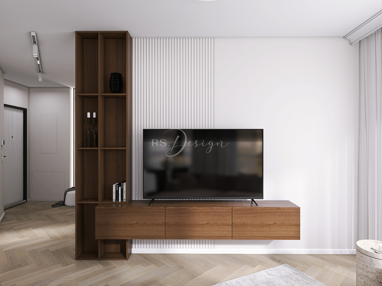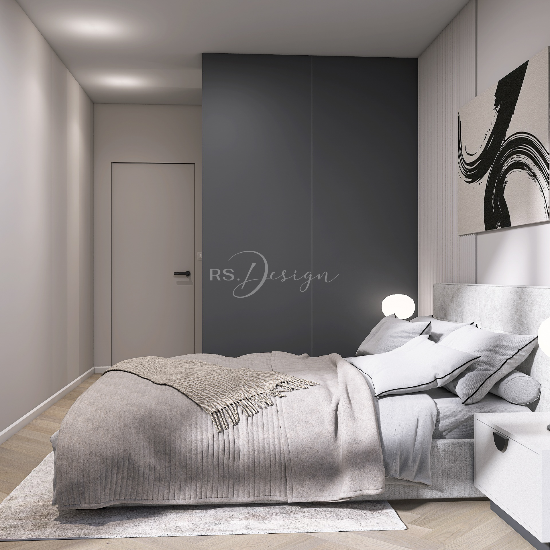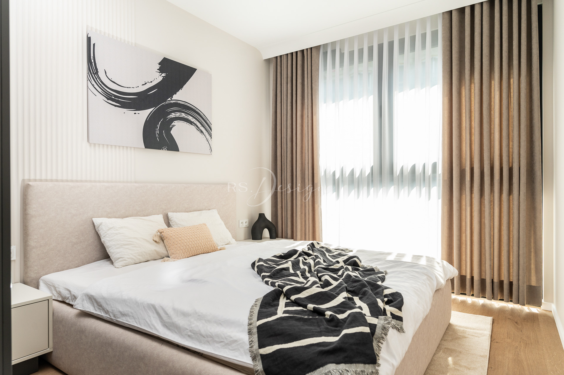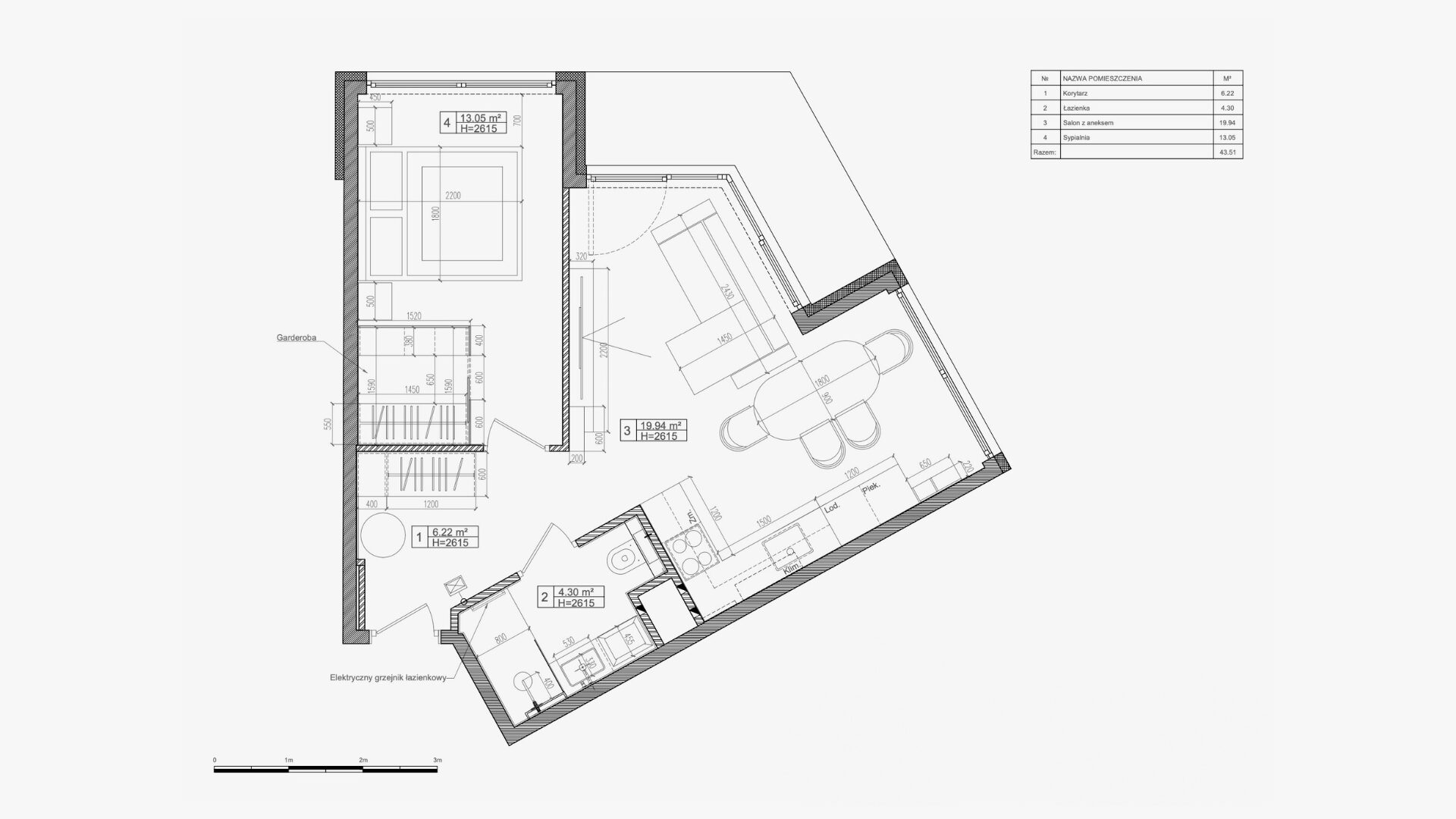 Realizacja apartamentu zaprojektowanego z myślą o najmie długoterminowym, który został wynajęty od razu po zakończeniu realizacji. Pomimo nierównoległych ścian udało się stworzyć ergonomiczny układ zapewniający wygodę przyszłym mieszkańcom. Strefa dzienna z aneksem kuchennym została urządzona w stonowanej palecie barw, gdzie ciepłe drewno i naturalne materiały współgrają z minimalistycznymi formami mebli. Wnętrze uzupełniają designerskie detale, takie jak miękka sofa w ciemnym odcieniu, elegancki stół z wygodnymi krzesłami oraz nastrojowe oświetlenie. Royal Space Design wspiera inwestorów i deweloperów w tworzeniu wnętrz, które nie tylko podnoszą komfort życia, ale także zwiększają wartość nieruchomości i wyróżniają ofertę na rynku – co potwierdza szybki sukces tej realizacji.