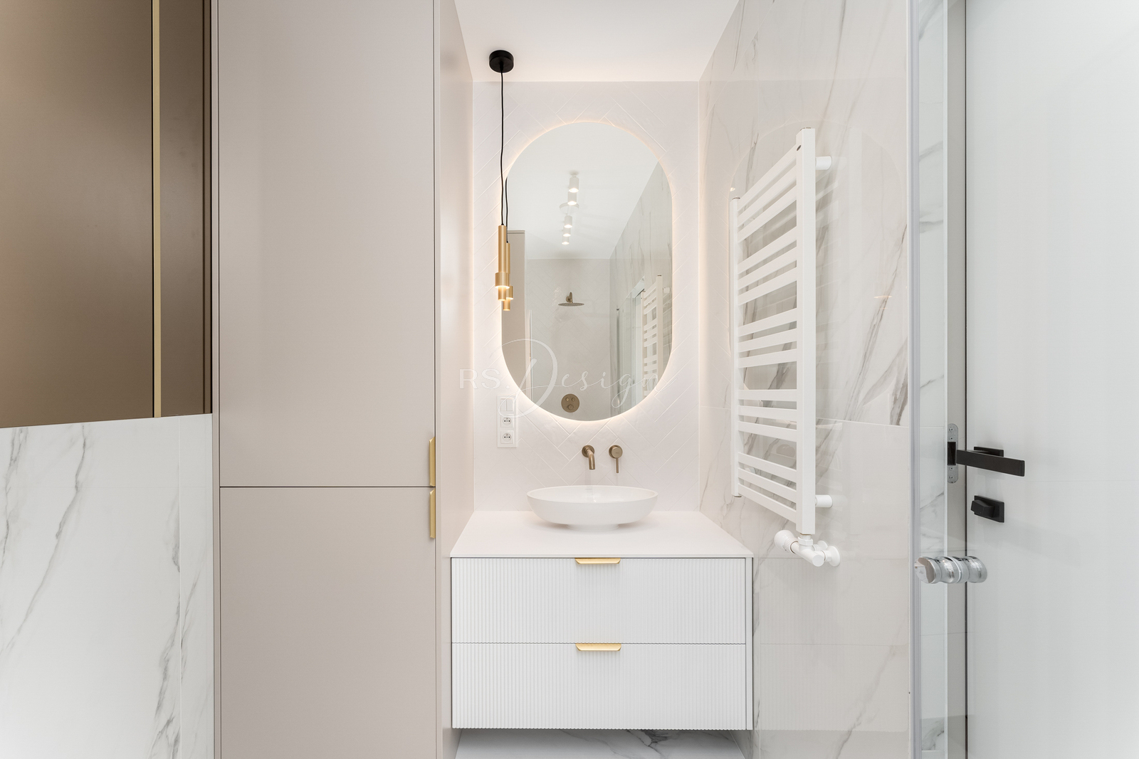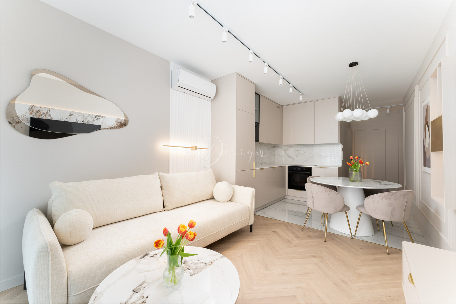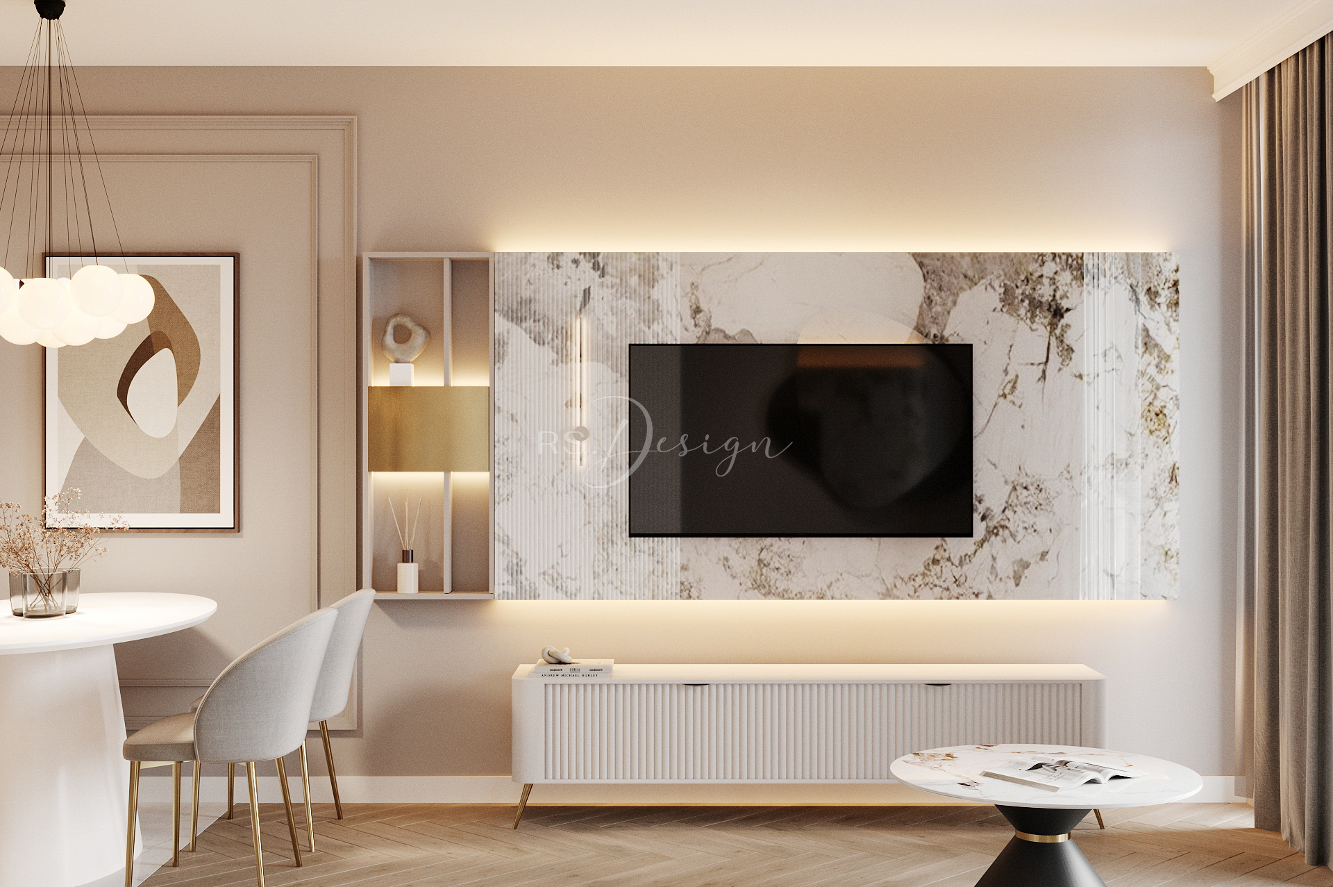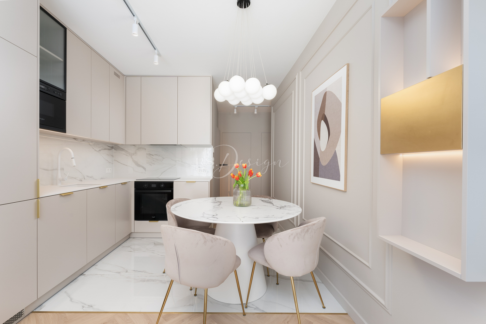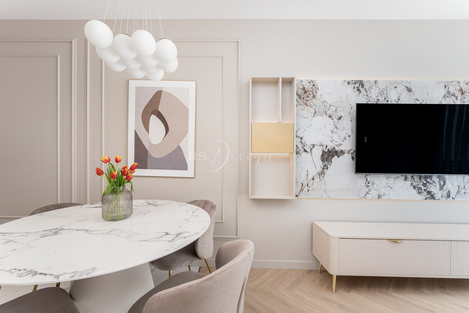 Nasz najnowszy projekt w inwestycji “Młyny Mogilska” to kwintesencja stylu modern classic – połączenia klasyki i nowoczesności w wyjątkowo harmonijnej formie. Wnętrze zachwyca subtelną paletą kolorów, w której dominują beże, taupe i biel, podkreślonych marmurowymi motywami oraz złotymi akcentami. Starannie dobrane geometryczne formy mebli oraz eleganckie detale, takie jak listwy ścienne i nastrojowe oświetlenie, tworzą przestrzeń, która łączy luksus z funkcjonalnością. Miękkie tkaniny i wyważone proporcje elementów sprawiają, że wnętrze emanuje ciepłem i wyrafinowaniem.