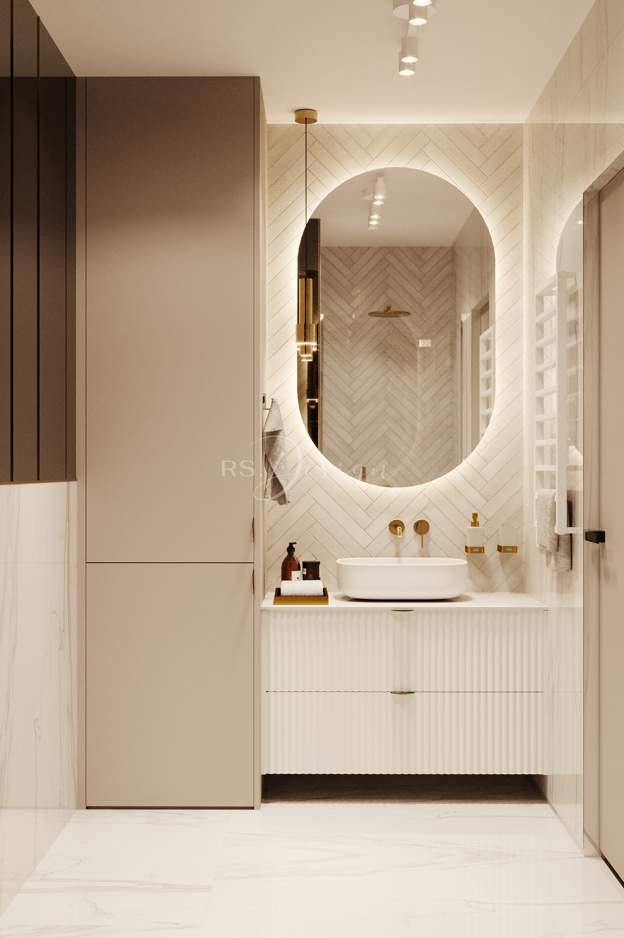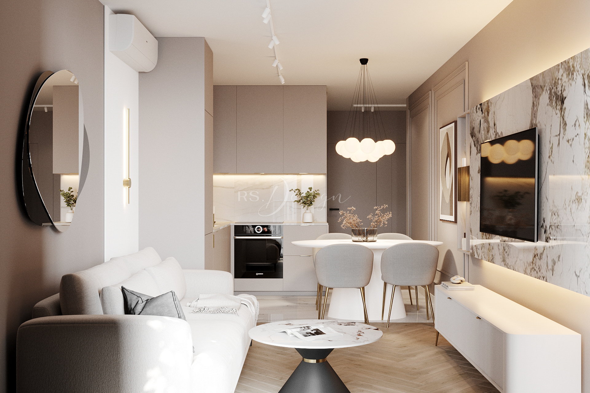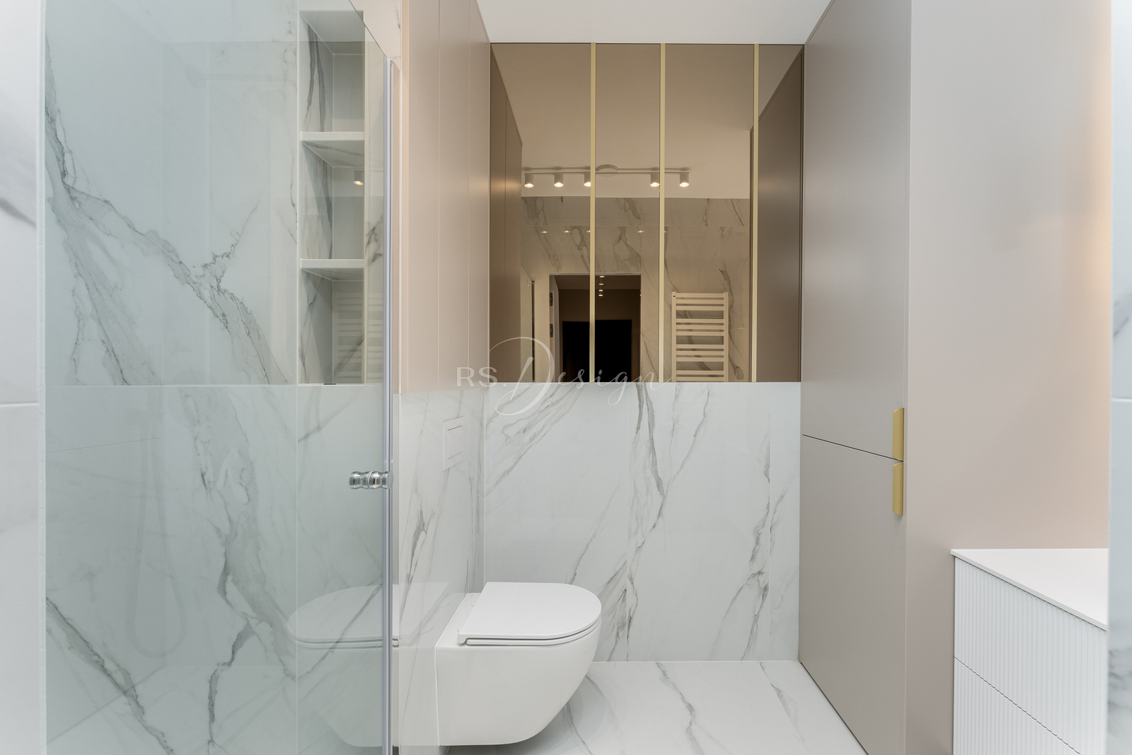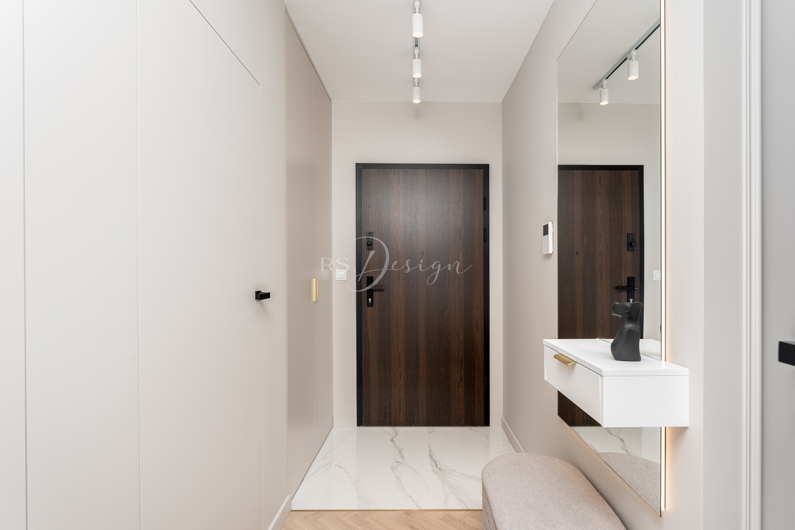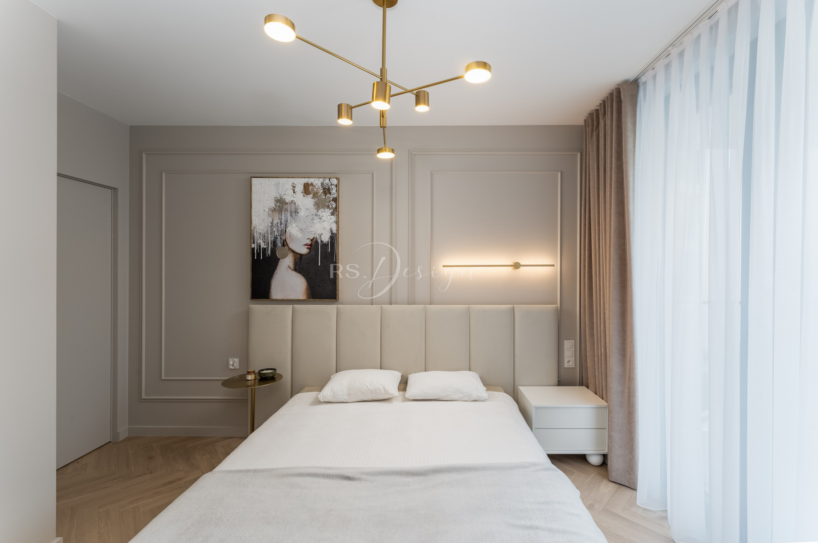 Nasz najnowszy projekt w inwestycji “Młyny Mogilska” to kwintesencja stylu modern classic – połączenia klasyki i nowoczesności w wyjątkowo harmonijnej formie. Wnętrze zachwyca subtelną paletą kolorów, w której dominują beże, taupe i biel, podkreślonych marmurowymi motywami oraz złotymi akcentami. Starannie dobrane geometryczne formy mebli oraz eleganckie detale, takie jak listwy ścienne i nastrojowe oświetlenie, tworzą przestrzeń, która łączy luksus z funkcjonalnością. Miękkie tkaniny i wyważone proporcje elementów sprawiają, że wnętrze emanuje ciepłem i wyrafinowaniem.