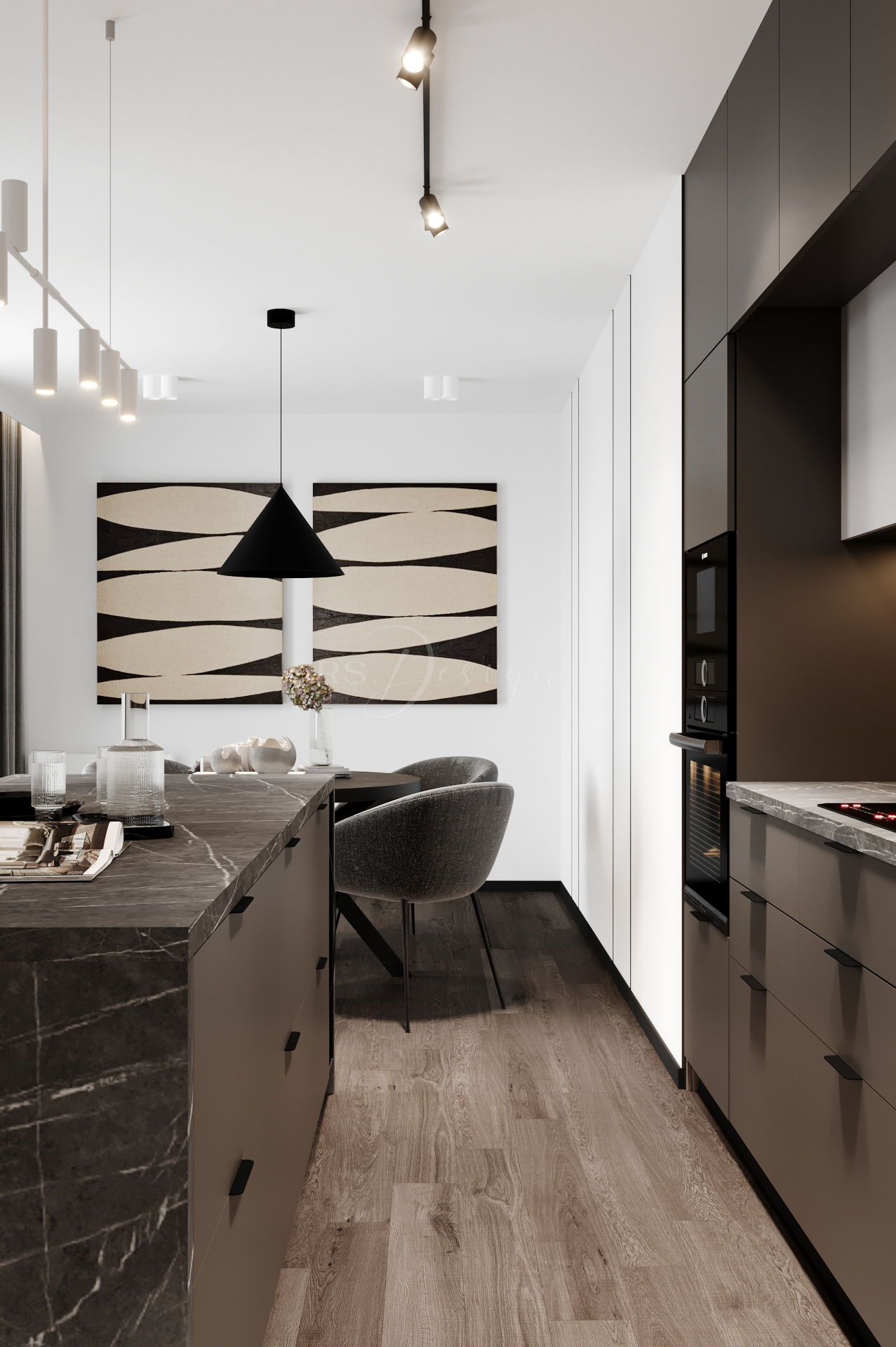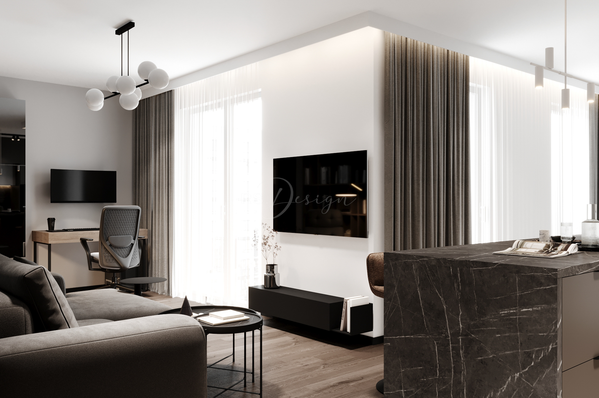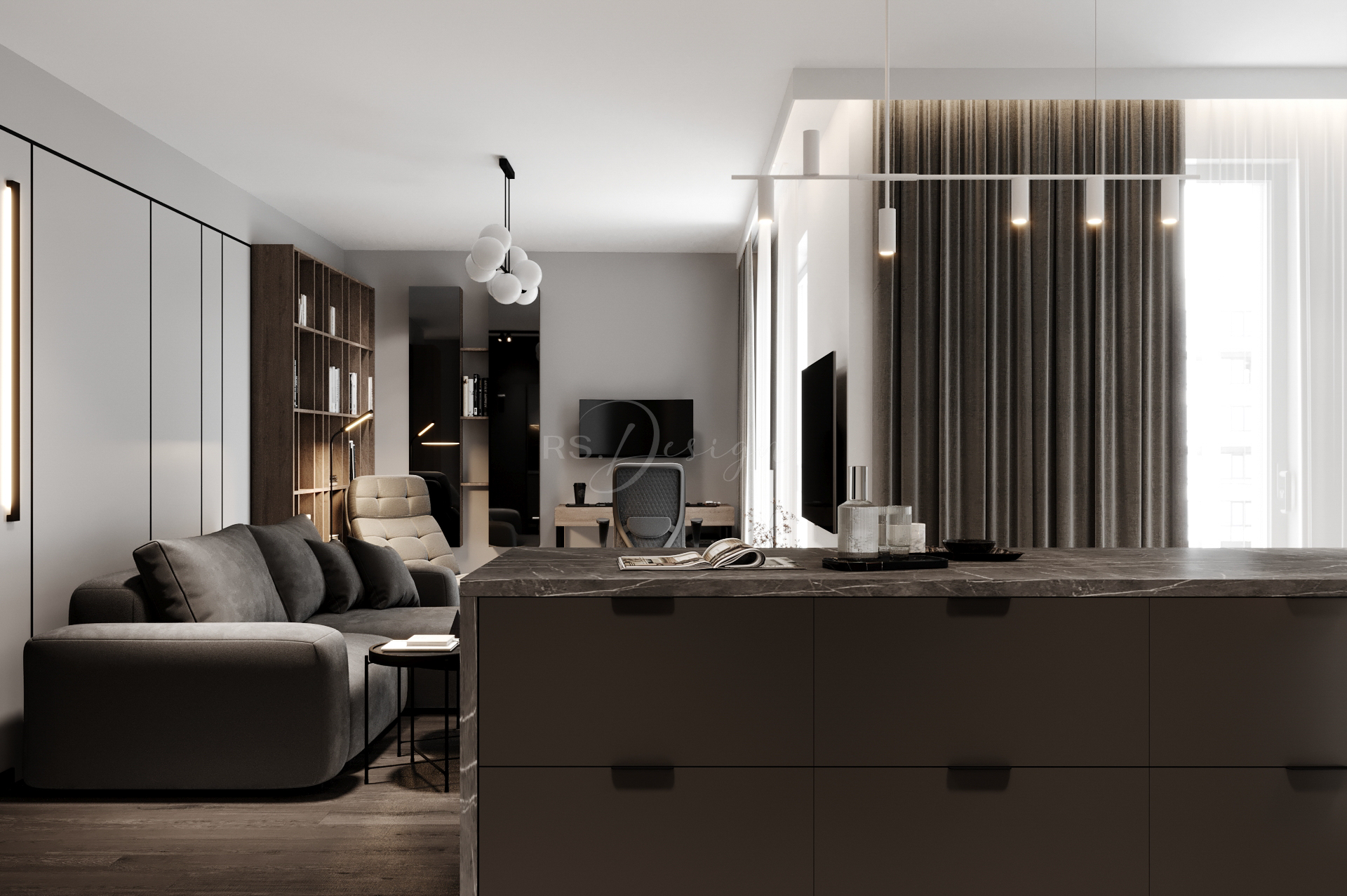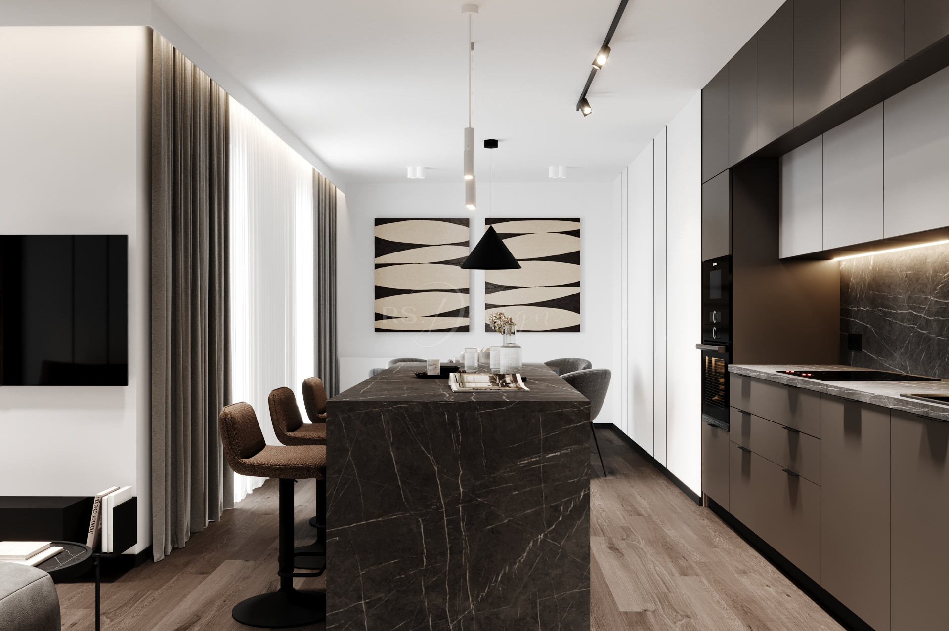 Mieszkanie zaprojektowano z myślą o nowoczesnym, komfortowym życiu w odrestaurowanej kamienicy. Wnętrze łączy elegancję naturalnych materiałów, stonowaną kolorystykę i funkcjonalne rozwiązania, które odpowiadają na potrzeby współczesnych mieszkańców. Centralną część stanowi przestronna strefa dzienna z dużymi przeszkleniami, wydzieloną częścią wypoczynkową i ergonomicznym miejscem do pracy. Kuchnia z monumentalną wyspą wykonana została w wysokim standardzie, tworząc idealne miejsce do wspólnego gotowania i spędzania czasu.