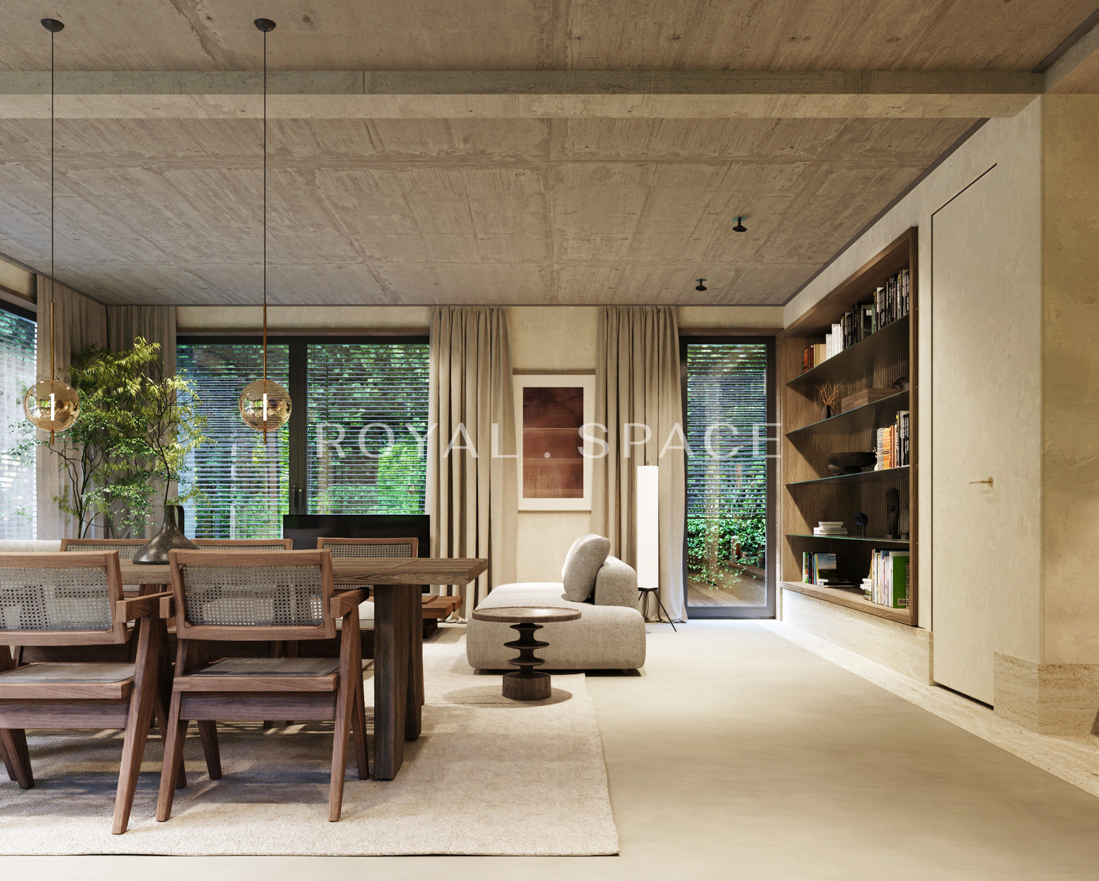 Apartament dwupoziomowy z możliwością podzielenia na 2 niezależne apartamenty o powierzchni 275m² z ogrodem (300m²) oferuje wyjątkową przestrzeń do życia i aranżacji. Panoramiczne przeszklenia sięgające aż 5,5 metra wysokości otwierają wnętrze na prywatny ogród, zapewniając naturalne światło i niepowtarzalne wrażenie przestronności.