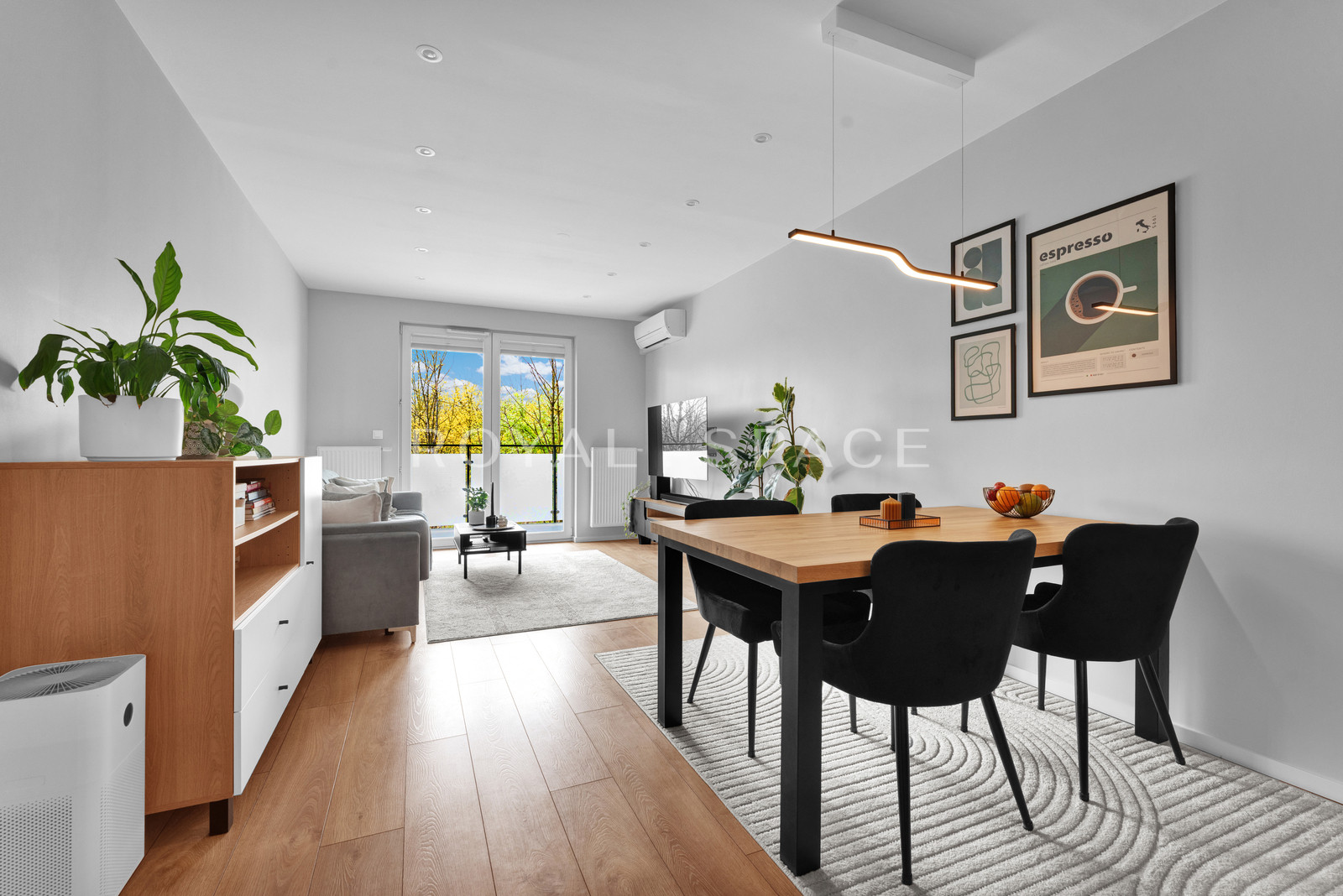 Największym atutem nieruchomości jest przestronny balkon o powierzchni 12 m² z ekspozycją zachodnią, dostępny z każdego pomieszczenia, co tworzy spójną i otwartą przestrzeń mieszkalną. Dodatkowym udogodnieniem jest klimatyzacja oraz praktyczny schowek w przedpokoju.
