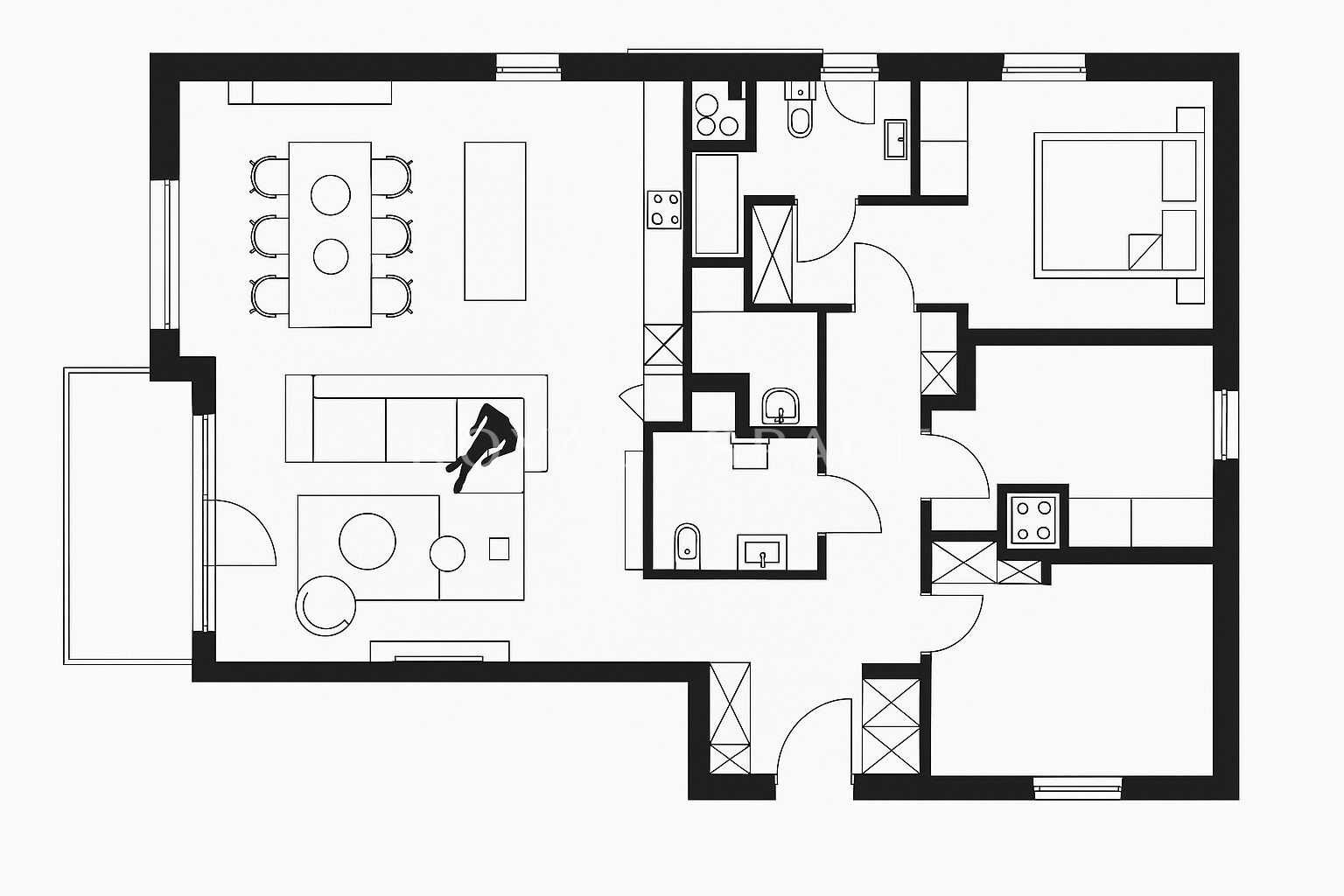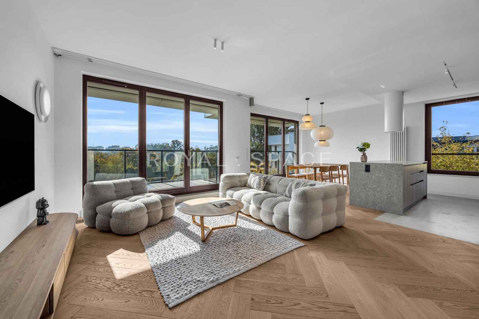 Nowoczesny apartament o powierzchni 110 m² został zaprojektowany przez architekta wnętrz i świeżo wykończony z dbałością o każdy detal. Duże przeszklenia od podłogi do sufitu wypełniają przestrzeń światłem dziennym i pozwalają podziwiać malowniczy widok na park i wodę. Całość utrzymana jest w jasnej, eleganckiej stylistyce z elementami nowoczesnego designu.