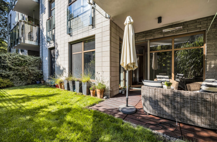Mamy przyjemność zaprezentować przestronny apartament z prywatnym ogrodem w prestiżowej inwestycji Bolero (Eko-Park), położony w spokojnej i zielonej części Mokotowa, tuż przy Polu Mokotowskim.