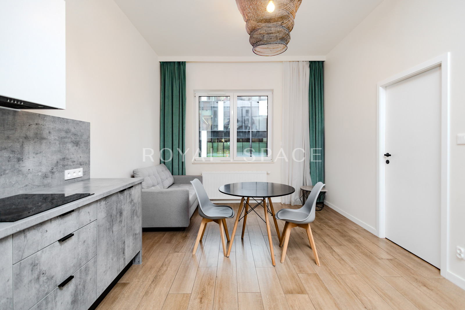 Wnętrze zostało wykończone z dbałością o detale i w wysokim standardzie. Apartament jest w pełni umeblowany oraz wyposażony w sprzęty AGD: pralkę, zmywarkę, lodówkę, zamrażarkę, płytę elektryczną, piekarnik oraz okap.