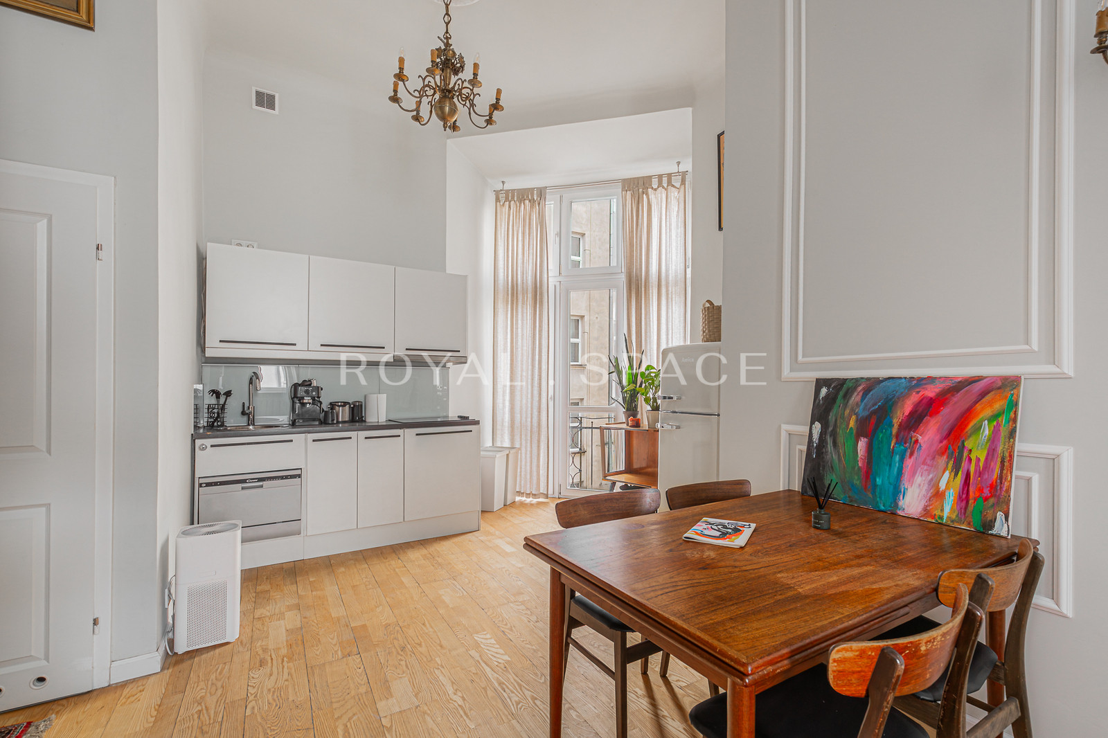 Apartament o powierzchni 41 m² wyróżnia się imponującą wysokością wnętrz sięgającą 3,8 m co daje poczucie przestrzeni i światła. Mieszkanie zostało świeżo wyremontowane i wykończone w nowoczesnym standardzie z dbałością o detale. Duże okna oraz francuski balkon nadają wnętrzu lekkości i elegancji. Lokal jest w pełni umeblowany i wyposażony w nowe sprzęty co pozwala na natychmiastowe wprowadzenie się bez dodatkowych nakładów.