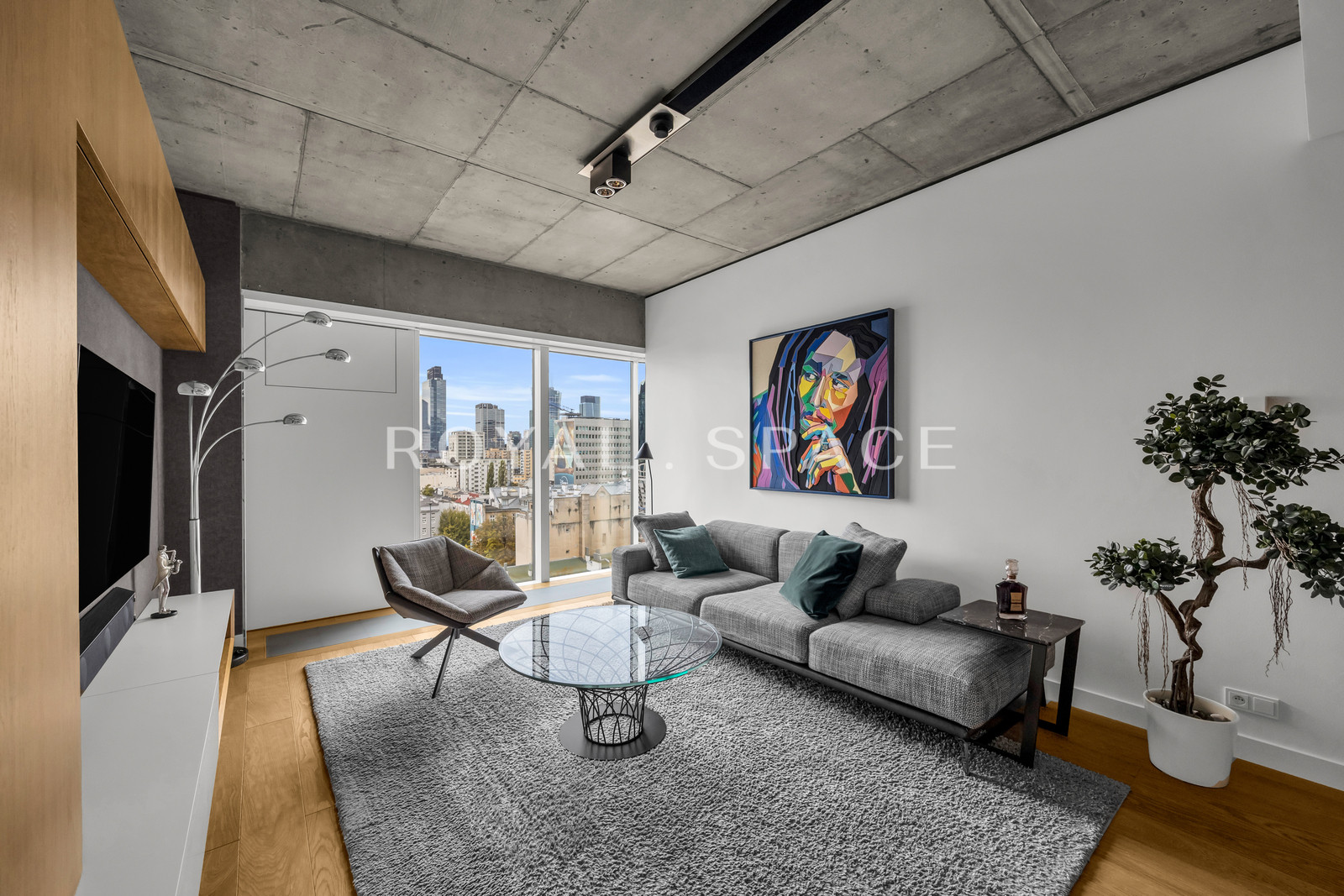 Apartament znajduje się na 10 piętrze wieżowca i oferuje zapierający dech w piersiach widok na panoramę Warszawy dzięki dużym przeszkleniom, które rozciągają się na całe mieszkanie. Wnętrze wyróżnia się przestronnością, wysokiej jakości materiałami wykończeniowymi oraz nowoczesnym designem. Dzięki systemowi inteligentnego domu HMS, mieszkańcy mają pełną kontrolę nad ogrzewaniem, oświetleniem oraz klimatyzacją.