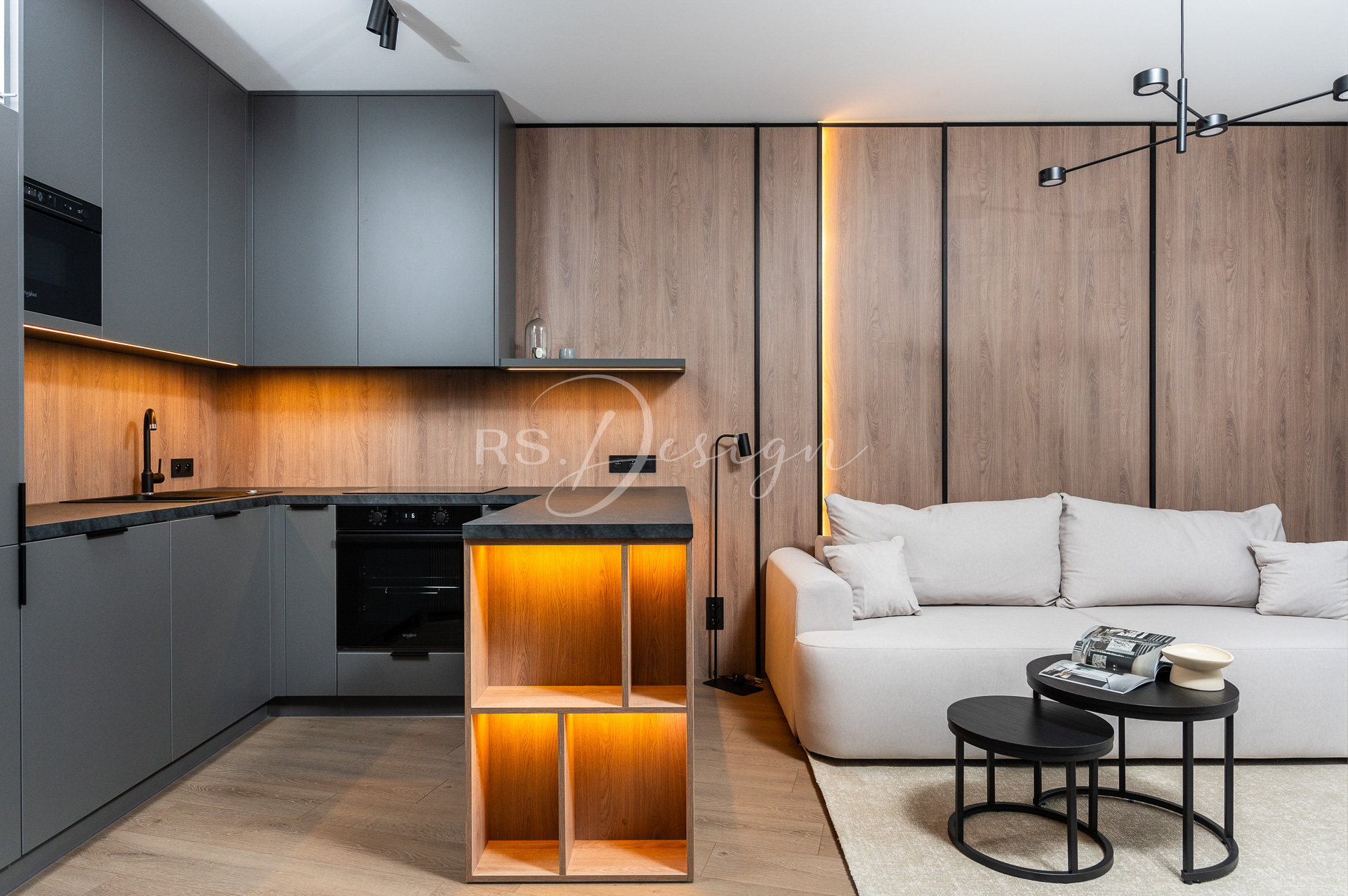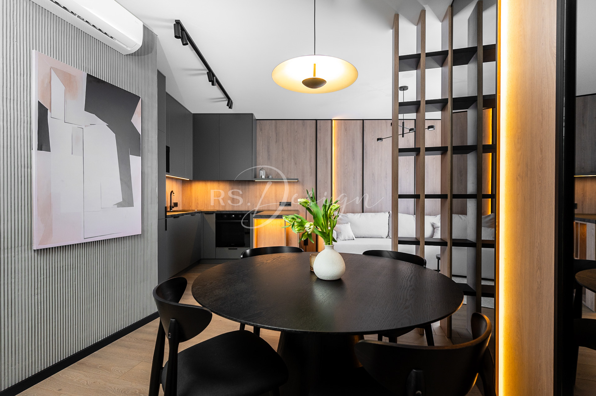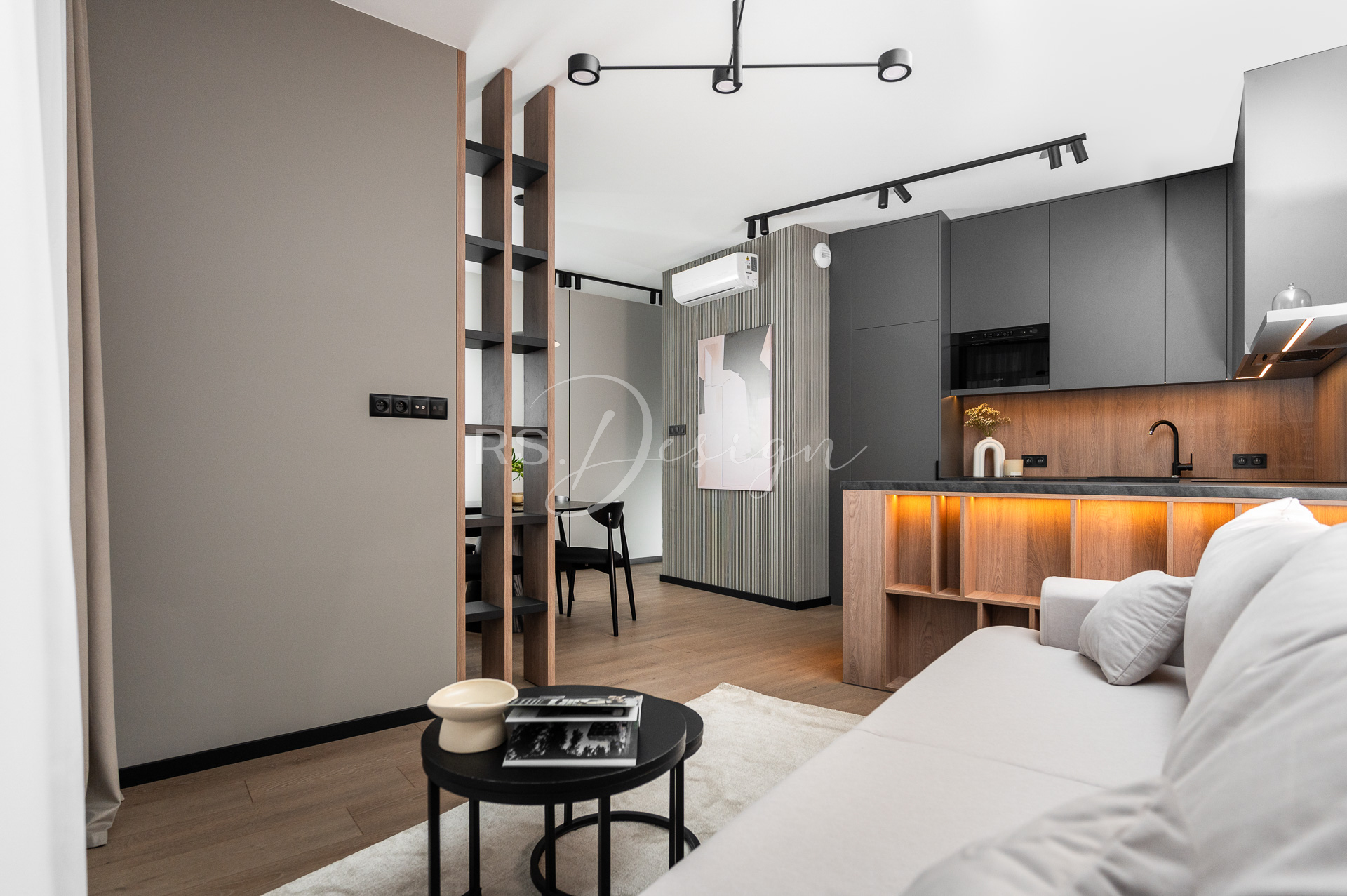 W tym wyjątkowym wnętrzu każdy detal został starannie zaprojektowany, aby połączyć estetykę z praktycznością. Pomimo wyzwań związanych z układem, przestrzeń zaaranżowano tak, by była maksymalnie funkcjonalna i jednocześnie zachwycająca wizualnie. Eleganckie połączenie drewna, szarości i czerni nadaje wnętrzu ponadczasowy styl, który wyróżnia się wyrafinowaną prostotą. Przemyślane rozwiązania, takie jak schowane szafy, wydzielona strefa jadalniana oraz doskonale zaprojektowana łazienka, zapewniają komfort codziennego użytkowania. Designerskie detale, w tym ażurowe regały, subtelne dekoracje i nastrojowe oświetlenie, dodają wnętrzu wyjątkowego charakteru. Całość tworzy harmonijną przestrzeń, w której piękno spotyka się z funkcjonalnością.