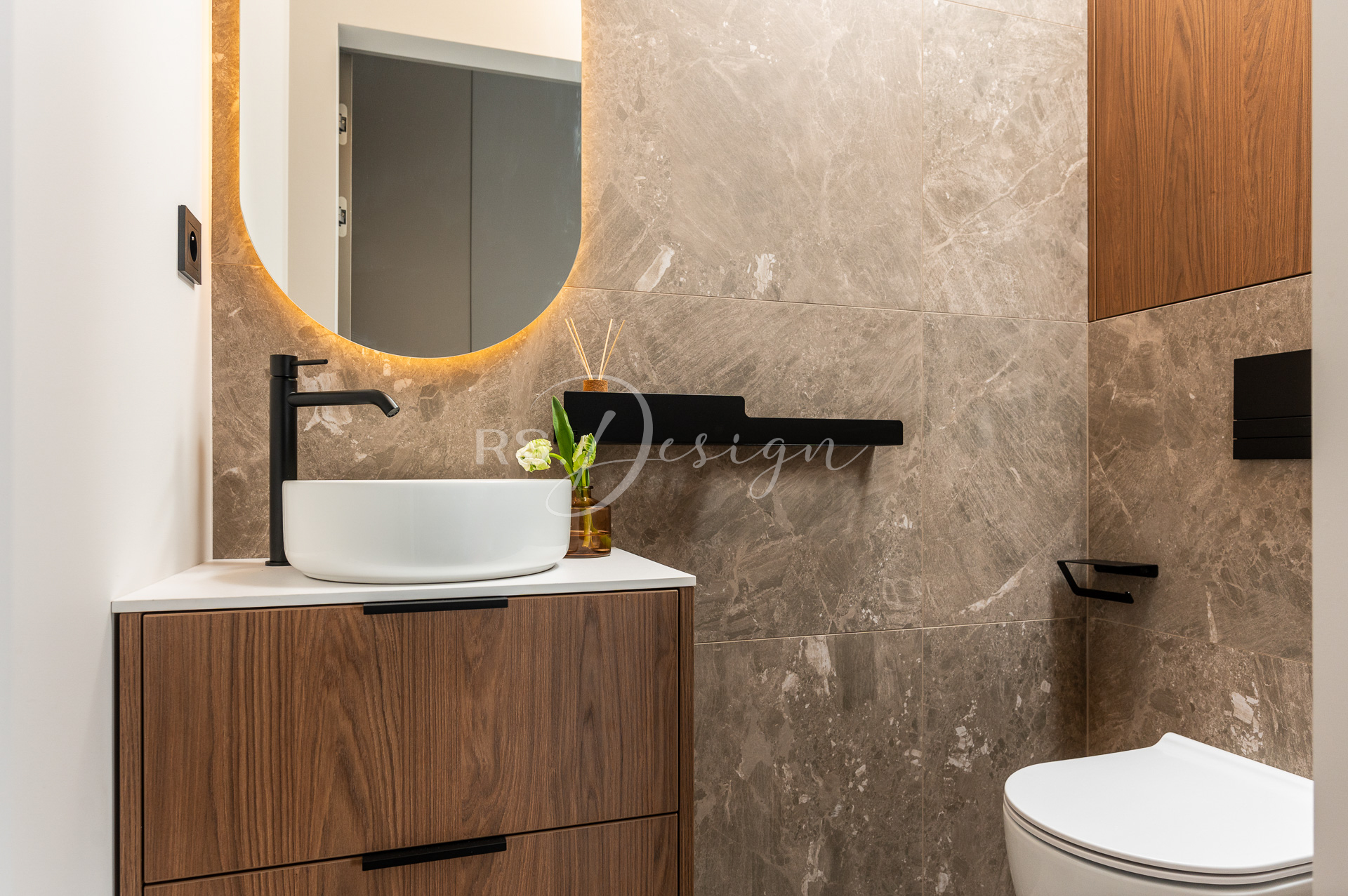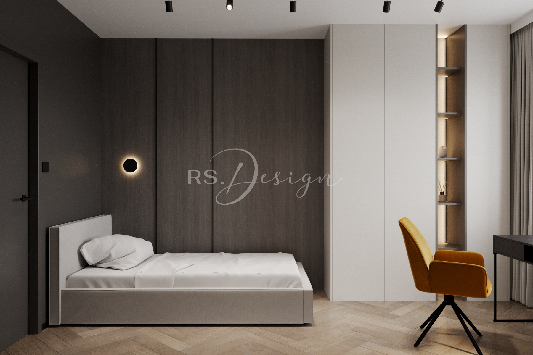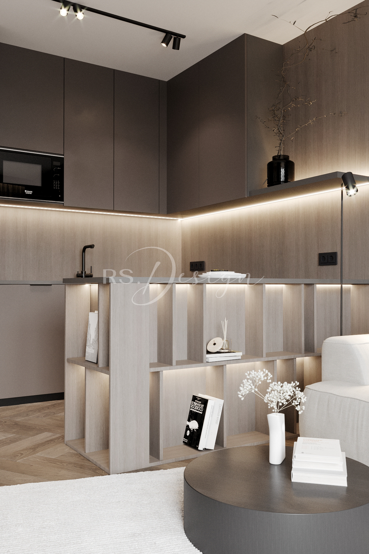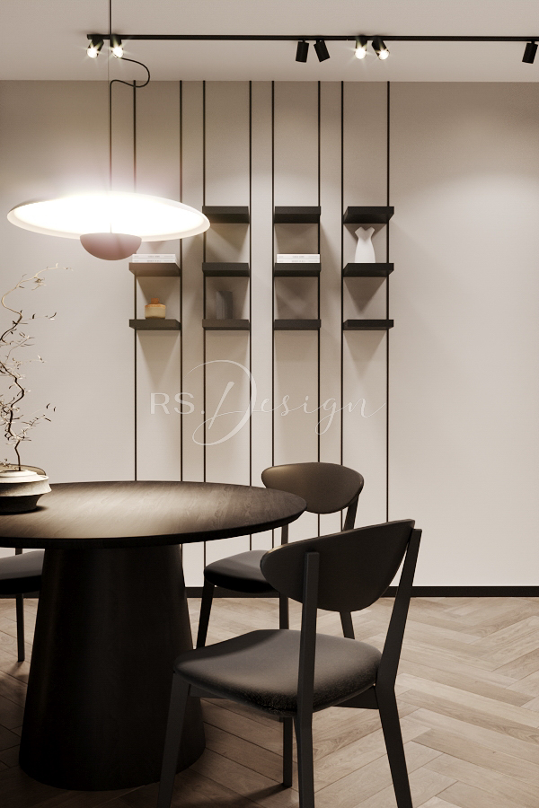 W tym wyjątkowym wnętrzu każdy detal został starannie zaprojektowany, aby połączyć estetykę z praktycznością. Pomimo wyzwań związanych z układem, przestrzeń zaaranżowano tak, by była maksymalnie funkcjonalna i jednocześnie zachwycająca wizualnie. Eleganckie połączenie drewna, szarości i czerni nadaje wnętrzu ponadczasowy styl, który wyróżnia się wyrafinowaną prostotą. Przemyślane rozwiązania, takie jak schowane szafy, wydzielona strefa jadalniana oraz doskonale zaprojektowana łazienka, zapewniają komfort codziennego użytkowania. Designerskie detale, w tym ażurowe regały, subtelne dekoracje i nastrojowe oświetlenie, dodają wnętrzu wyjątkowego charakteru. Całość tworzy harmonijną przestrzeń, w której piękno spotyka się z funkcjonalnością.