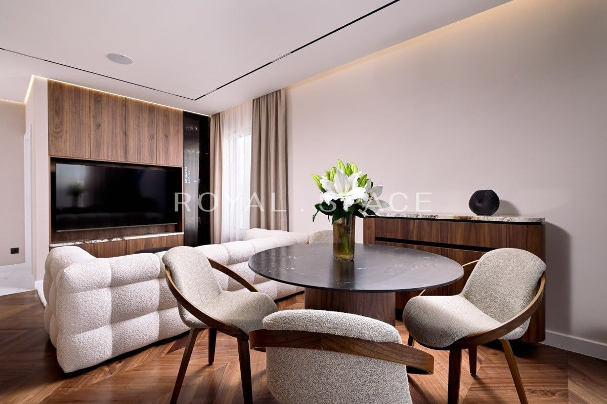 Функціональні та світлі апартаменти, оздоблені на дуже високому рівні, з балконом площею 4,6 м². Простір спроєктований з увагою до кожної деталі, із застосуванням натуральних матеріалів: