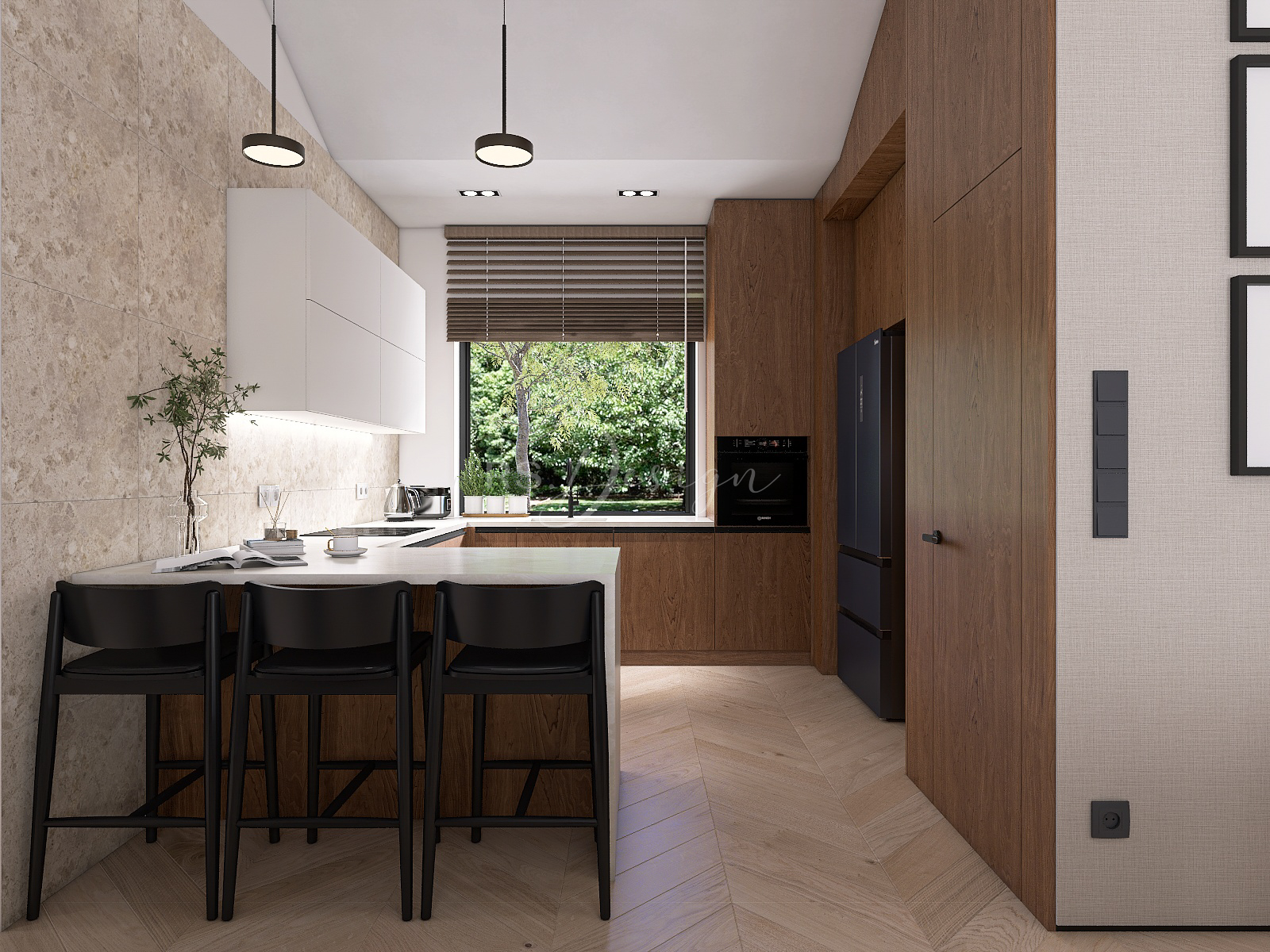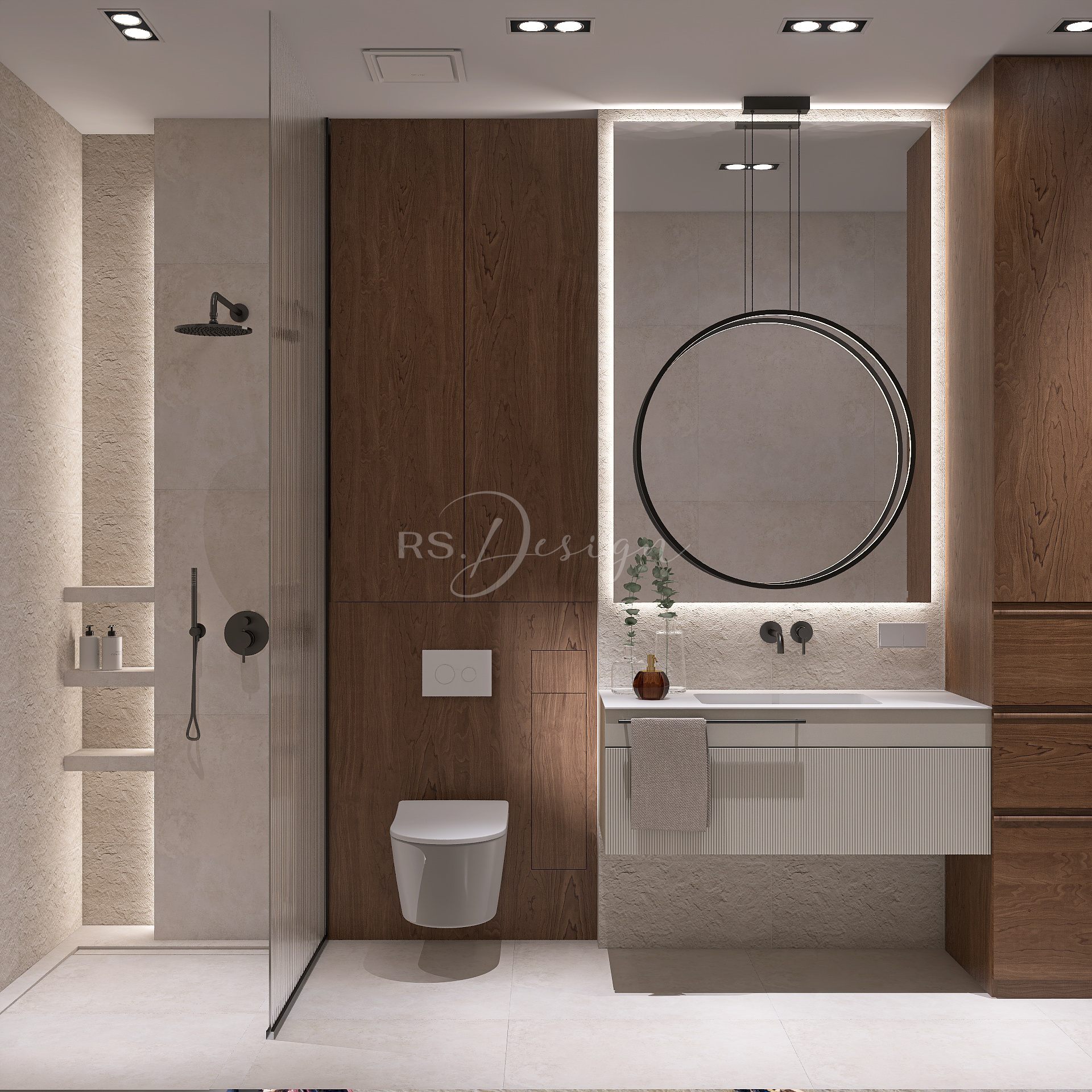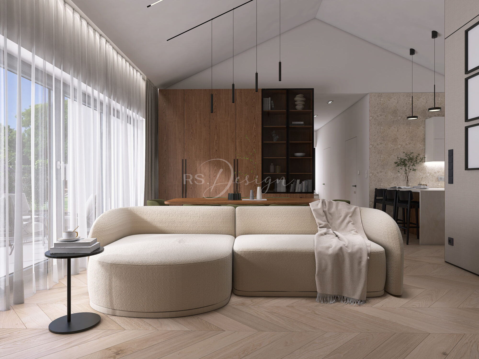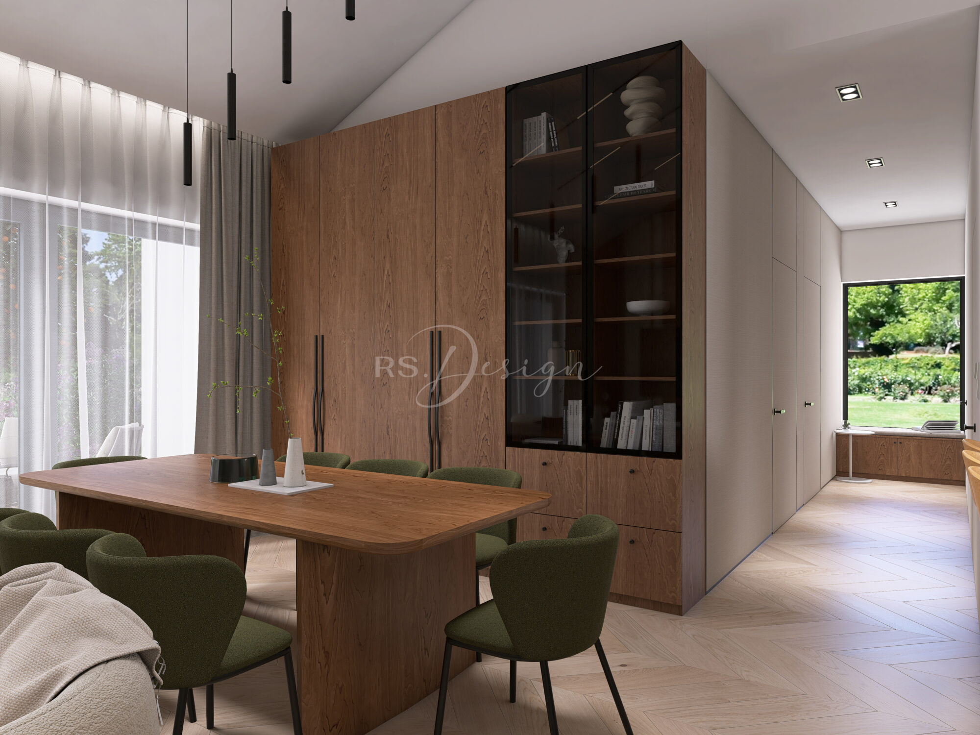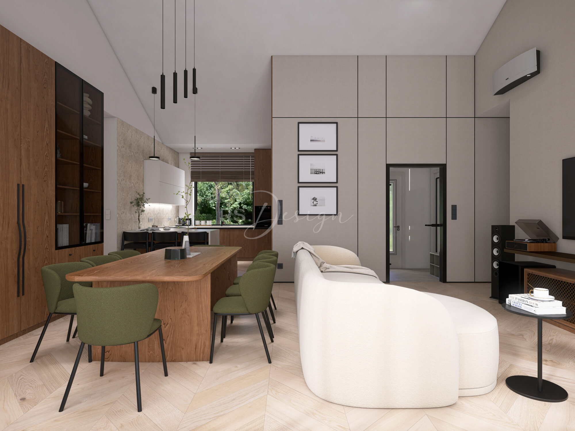 W tym projekcie skupiliśmy się na zaprojektowaniu parteru domu , dostosowując zakres prac do oczekiwań klienta. Wnętrza utrzymaliśmy w nowoczesnym, minimalistycznym stylu, łącząc naturalne materiały z eleganckimi akcentami. Całość opiera się na harmonijnym połączeniu ciepłych odcieni drewna, jasnych powierzchni i czarnych detali, które nadają przestrzeni elegancji i funkcjonalności. Kuchnia to zabudowa na pełną wysokość, z kamiennymi blatami i dyskretnym oświetleniem podkreślającym jej nowoczesny charakter. W salonie i jadalni postawiliśmy na duże przeszklenia, które wpuszczają mnóstwo naturalnego światła, oraz starannie dobrane meble – jasną podłogę w jodełkę, beżową sofę i drewniany stół z oliwkowymi krzesłami. Łazienki zaprojektowaliśmy w spójnej estetyce, zestawiając drewno z jasnym kamieniem, a podświetlane okrągłe lustra i ryflowane szkło w kabinach prysznicowych dodają im lekkości i nowoczesnego charakteru. Każdy projekt dostosowujemy indywidualnie – niezależnie od tego, czy tworzymy koncepcję całego domu, czy tylko wybranej części.