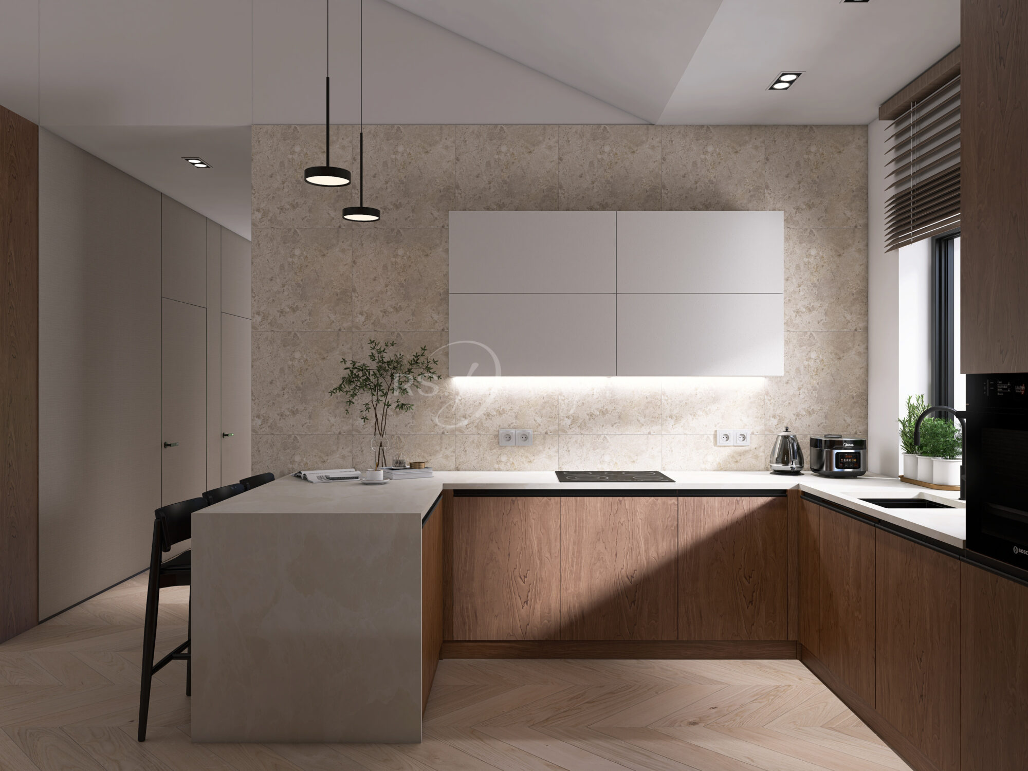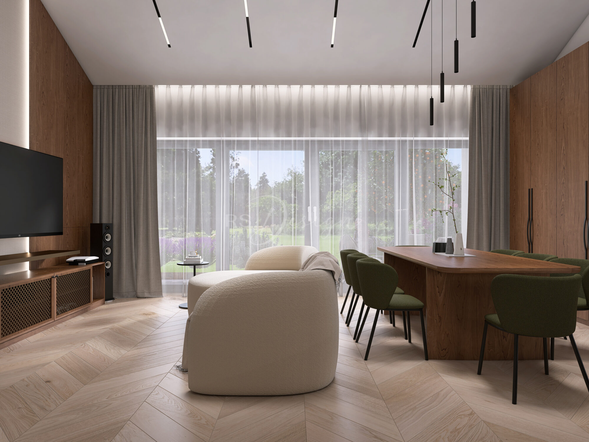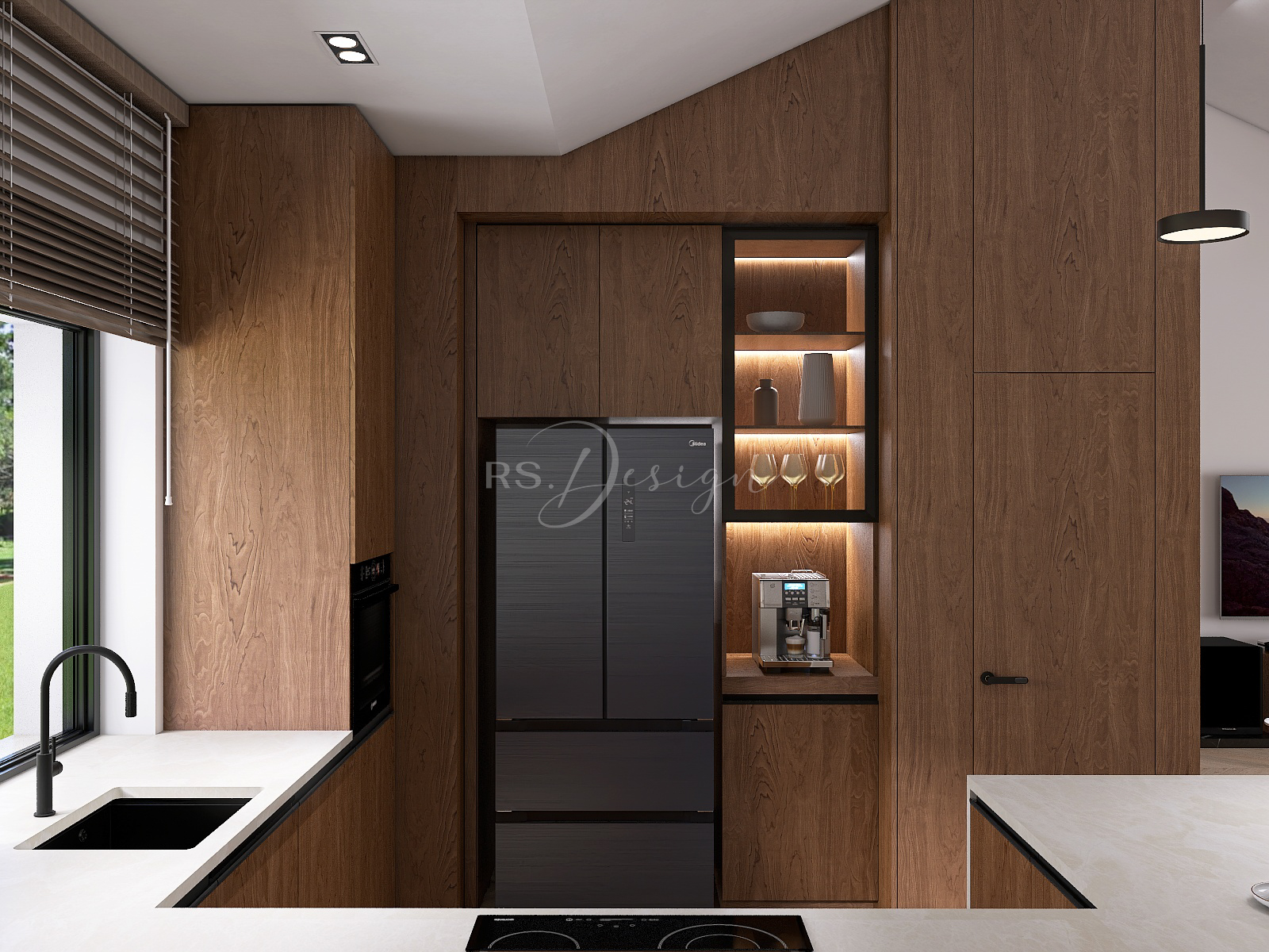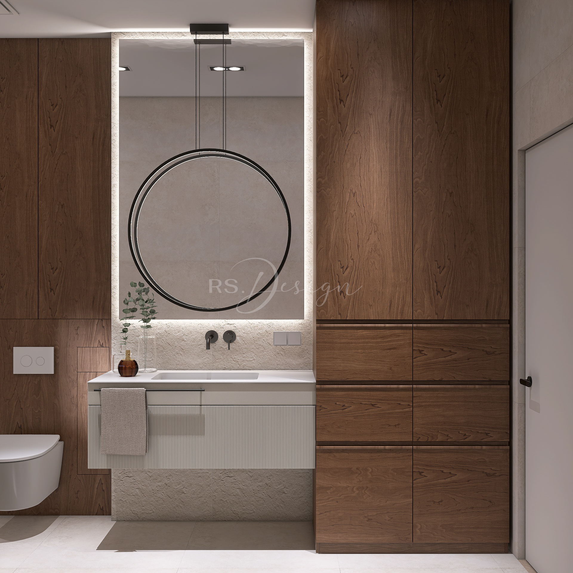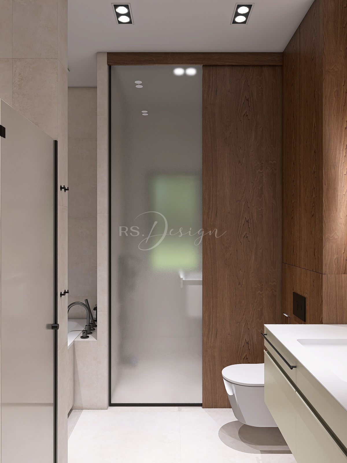 W tym projekcie skupiliśmy się na zaprojektowaniu parteru domu , dostosowując zakres prac do oczekiwań klienta. Wnętrza utrzymaliśmy w nowoczesnym, minimalistycznym stylu, łącząc naturalne materiały z eleganckimi akcentami. Całość opiera się na harmonijnym połączeniu ciepłych odcieni drewna, jasnych powierzchni i czarnych detali, które nadają przestrzeni elegancji i funkcjonalności. Kuchnia to zabudowa na pełną wysokość, z kamiennymi blatami i dyskretnym oświetleniem podkreślającym jej nowoczesny charakter. W salonie i jadalni postawiliśmy na duże przeszklenia, które wpuszczają mnóstwo naturalnego światła, oraz starannie dobrane meble – jasną podłogę w jodełkę, beżową sofę i drewniany stół z oliwkowymi krzesłami. Łazienki zaprojektowaliśmy w spójnej estetyce, zestawiając drewno z jasnym kamieniem, a podświetlane okrągłe lustra i ryflowane szkło w kabinach prysznicowych dodają im lekkości i nowoczesnego charakteru. Każdy projekt dostosowujemy indywidualnie – niezależnie od tego, czy tworzymy koncepcję całego domu, czy tylko wybranej części.