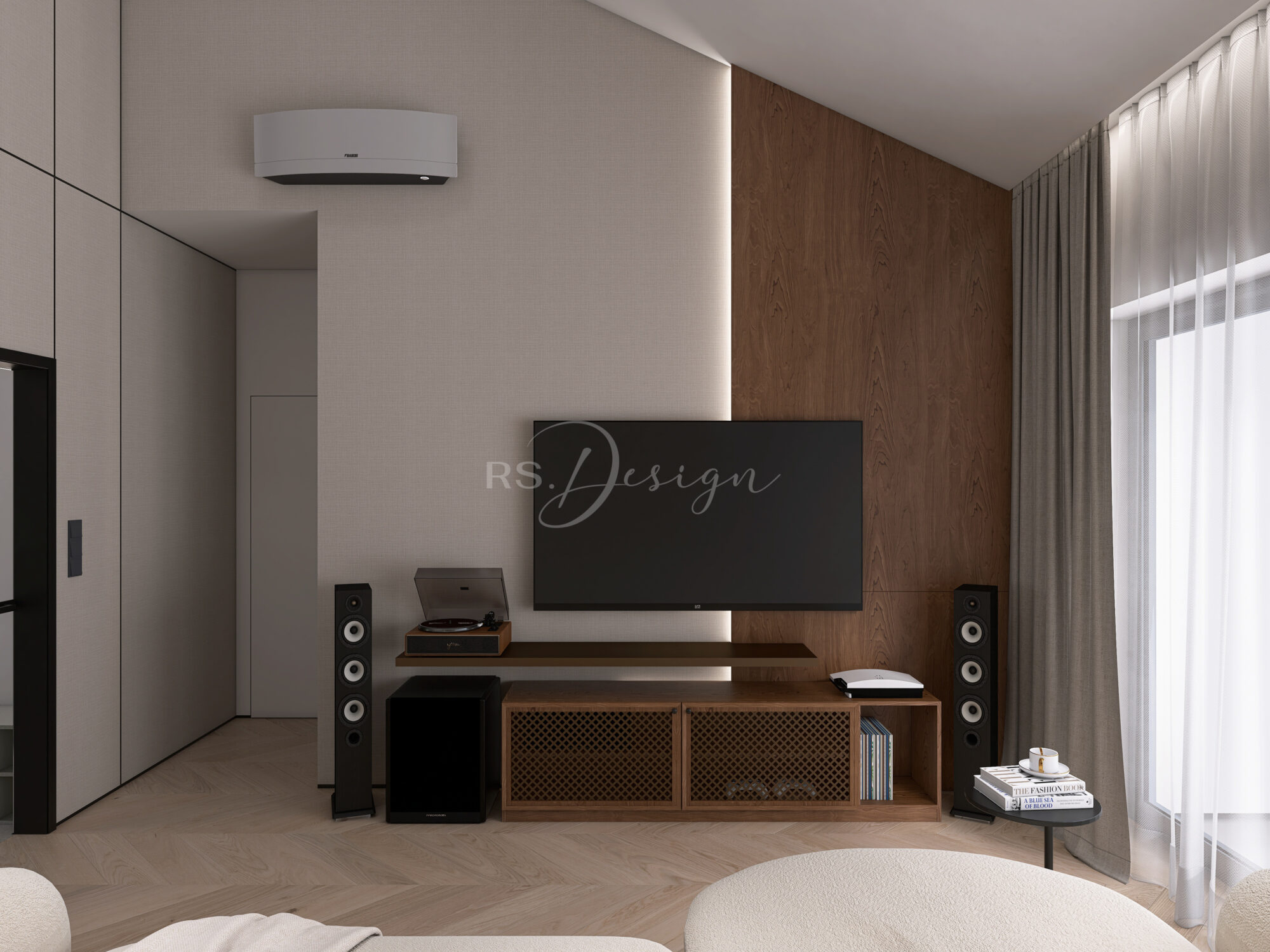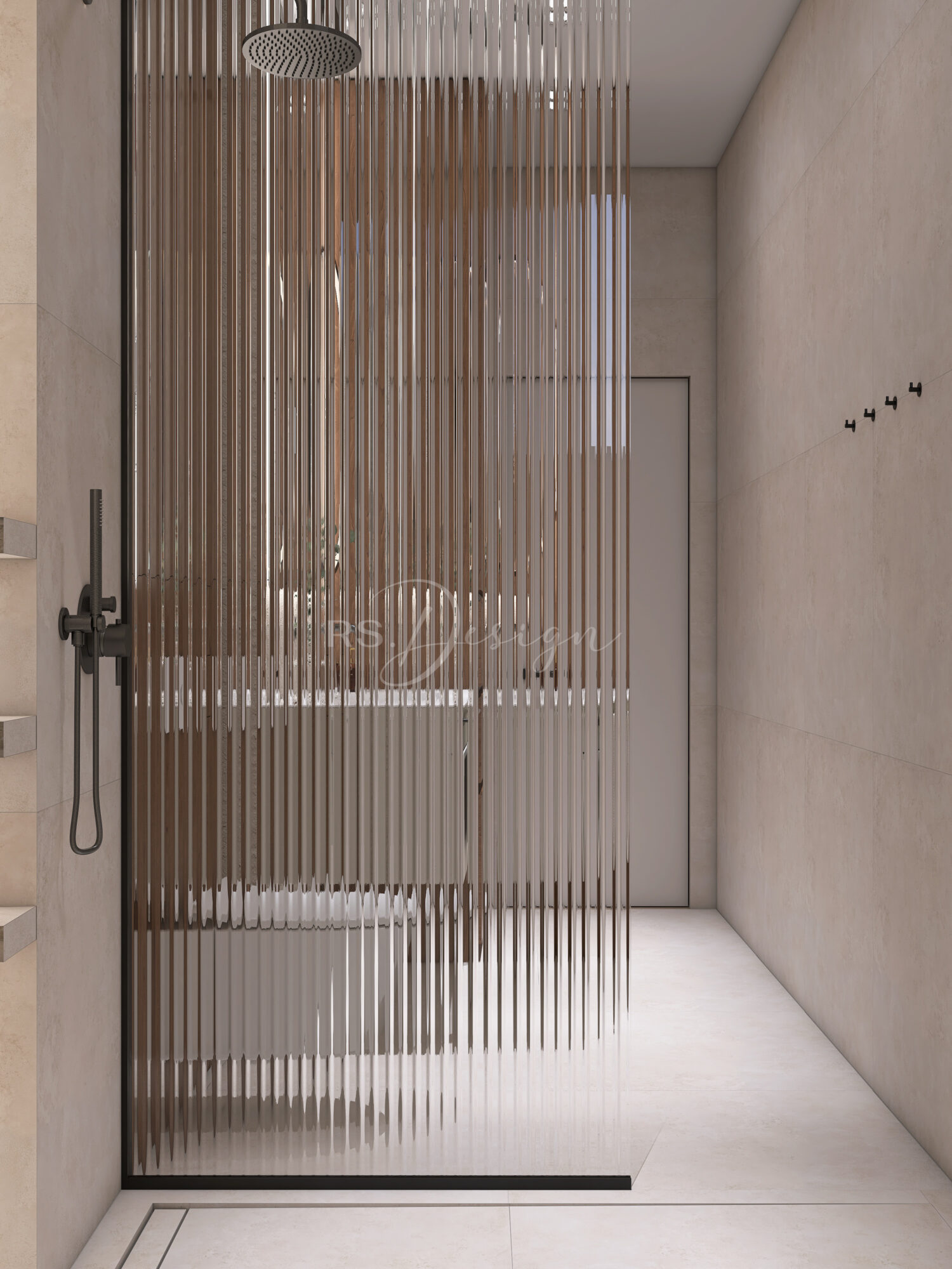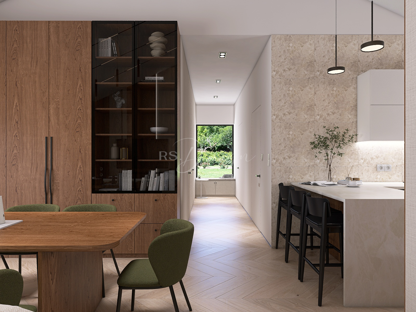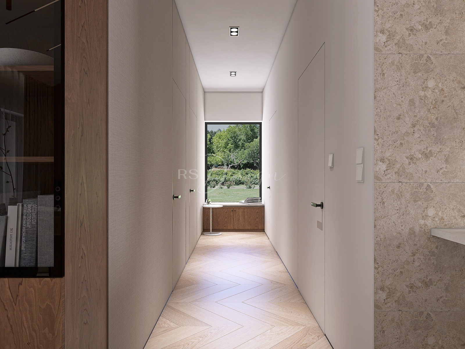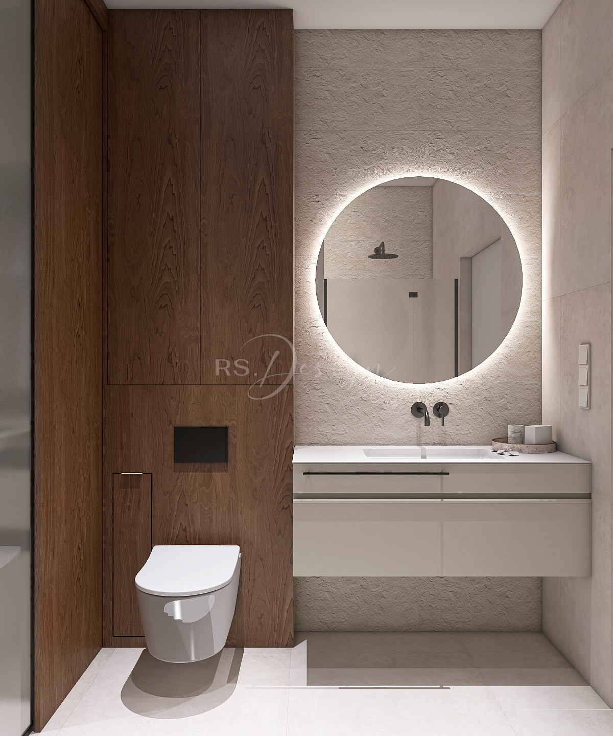 W tym projekcie skupiliśmy się na zaprojektowaniu parteru domu , dostosowując zakres prac do oczekiwań klienta. Wnętrza utrzymaliśmy w nowoczesnym, minimalistycznym stylu, łącząc naturalne materiały z eleganckimi akcentami. Całość opiera się na harmonijnym połączeniu ciepłych odcieni drewna, jasnych powierzchni i czarnych detali, które nadają przestrzeni elegancji i funkcjonalności. Kuchnia to zabudowa na pełną wysokość, z kamiennymi blatami i dyskretnym oświetleniem podkreślającym jej nowoczesny charakter. W salonie i jadalni postawiliśmy na duże przeszklenia, które wpuszczają mnóstwo naturalnego światła, oraz starannie dobrane meble – jasną podłogę w jodełkę, beżową sofę i drewniany stół z oliwkowymi krzesłami. Łazienki zaprojektowaliśmy w spójnej estetyce, zestawiając drewno z jasnym kamieniem, a podświetlane okrągłe lustra i ryflowane szkło w kabinach prysznicowych dodają im lekkości i nowoczesnego charakteru. Każdy projekt dostosowujemy indywidualnie – niezależnie od tego, czy tworzymy koncepcję całego domu, czy tylko wybranej części.